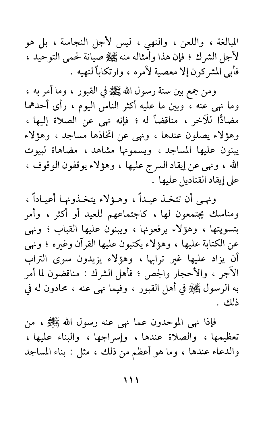 ونهى أن تتخذ عيدا، وهؤلاء يتخذونها أعيادا، ومناسك يجتمعون لها، كاجتماعهم للعيد أو أكثر؛ وأمر بتسويتها، وهؤلاء يرفعونها، ويبنون عليها القباب; ونهى عن الكتابة عليها، وهؤلاء يكتبون عليها القرآن وغيره; ونهى أن يزاد عليها غير ترابها، وهؤلاء يزيدون سوى التراب الآجر، والأحجار والجص; فأهل الشرك مناقضون لما أمر به الرسول صلى الله عليه وسلم في أهل القبور، وفيما نهى عنه، محادون له في ذلك.