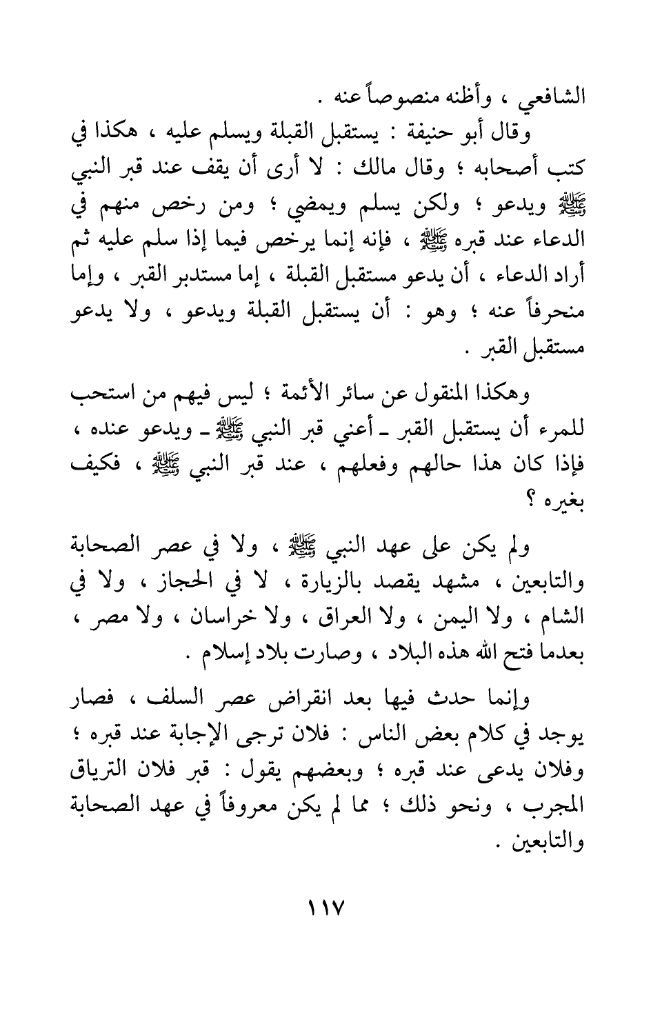 وهكذا المنقول عن سائر الأئمة; ليس فيهم من استحب للمرء أن يستقبل القبر - أعني قبر النبي صلى الله عليه وسلم - ويدعو عنده؛ فإذا كان هذا حالهم وفعلهم، عند قبر النبي صلى الله عليه وسلم فكيف بغيره؟