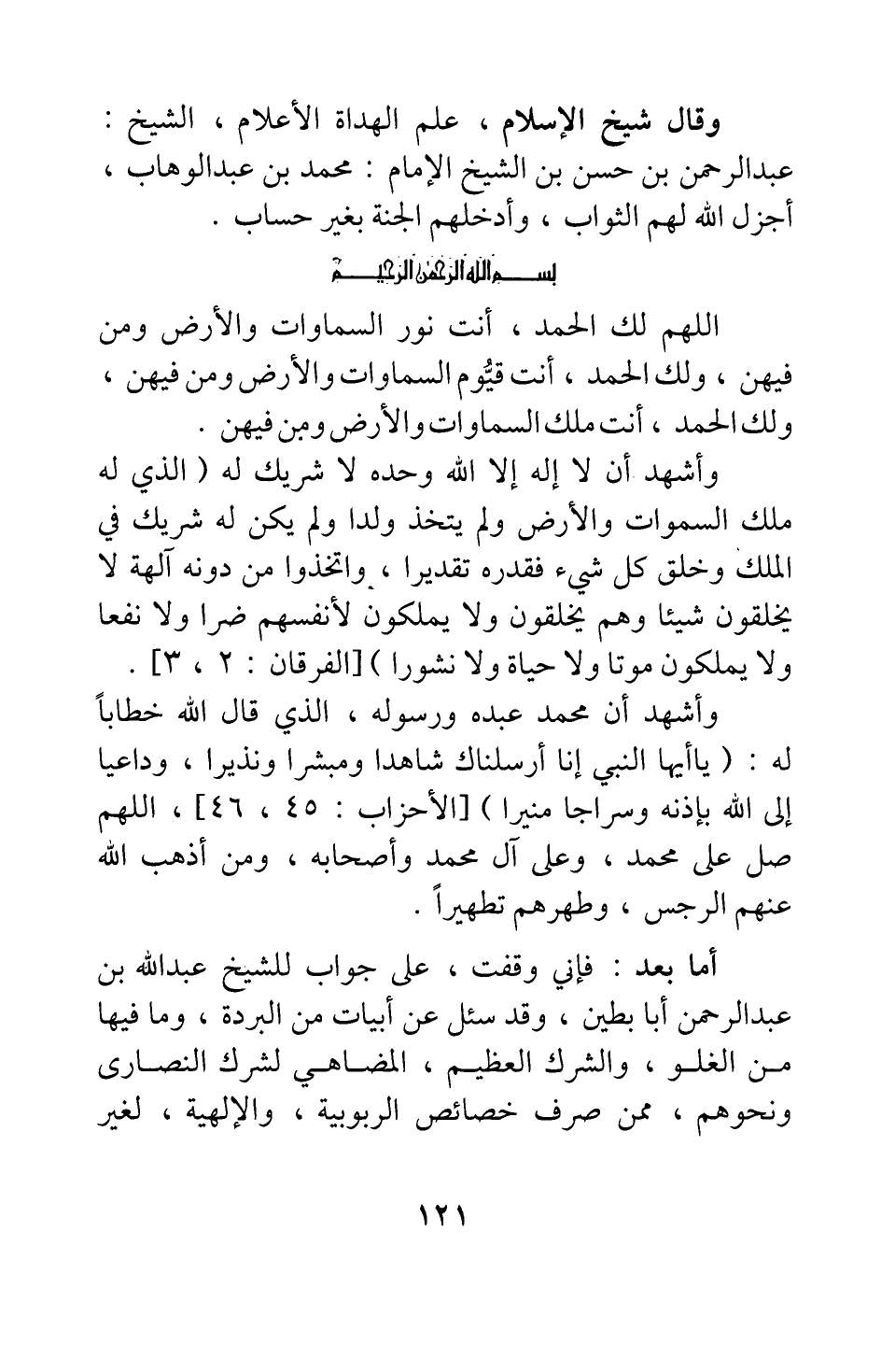 وقال شيخ الإسلام، علم الهداة الأعلام، الشيخ عبد الرحمن بن حسن بن الشيخ الإمام محمد بن عبد الوهاب، أجزل الله لهم الثواب، وأدخلهم الجنة بغير حساب: