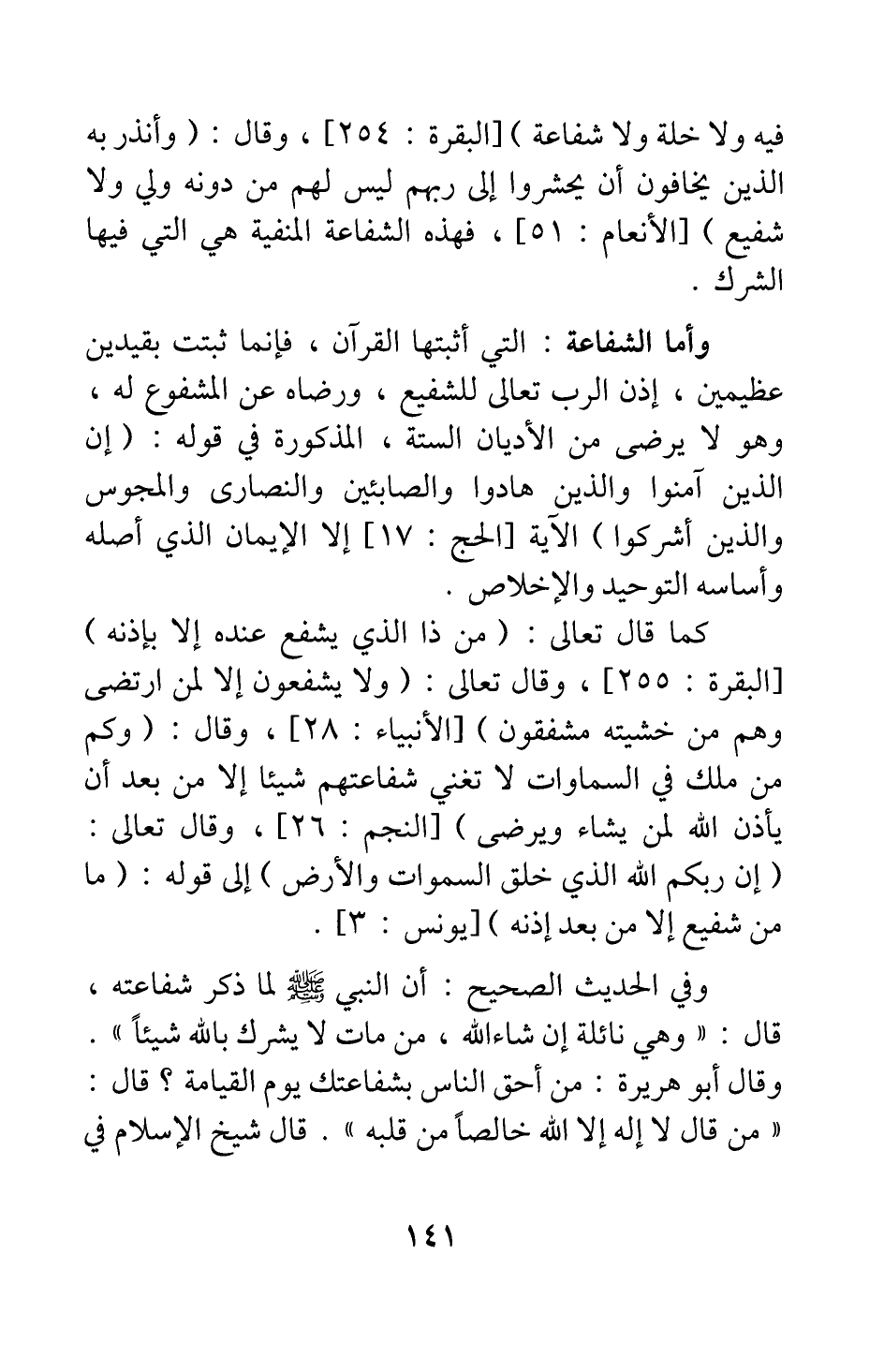 فِيهِ وَلا خُلَّةٌ وَلا شَفَاعَةٌ} [سورة البقرة آية: 254] ، وقال: {وَأَنْذِرْ بِهِ الَّذِينَ يَخَافُونَ أَنْ يُحْشَرُوا إِلَى رَبِّهِمْ لَيْسَ لَهُمْ مِنْ دُونِهِ وَلِيٌّ وَلا شَفِيعٌ} [سورة الأنعام آية: 51] ؛ فهذه الشفاعة المنفية هي التي فيها الشرك.