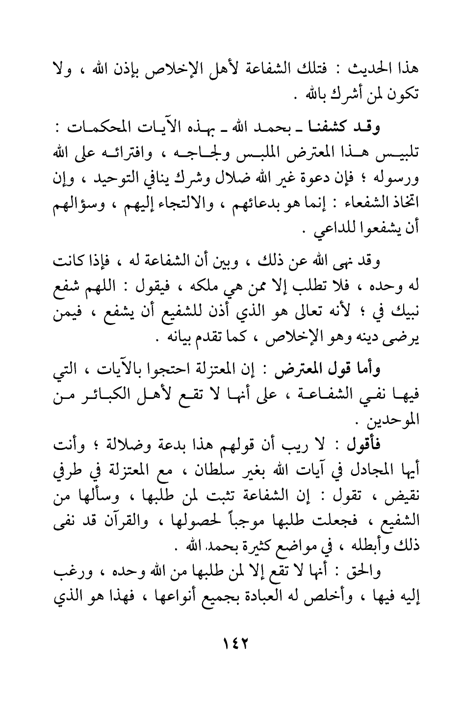 فأقول: لا ريب أن قولهم هذا بدعة وضلالة، وأنت أيها المجادل في آيات الله بغير سلطان، مع المعتزلة في طرفي نقيض، تقول: إن الشفاعة تثبت لمن طلبها، وسألها من الشفيع؛ فجعلت طلبها موجبا لحصولها، والقرآن قد نفى ذلك وأبطله، في مواضع كثيرة بحمد الله.