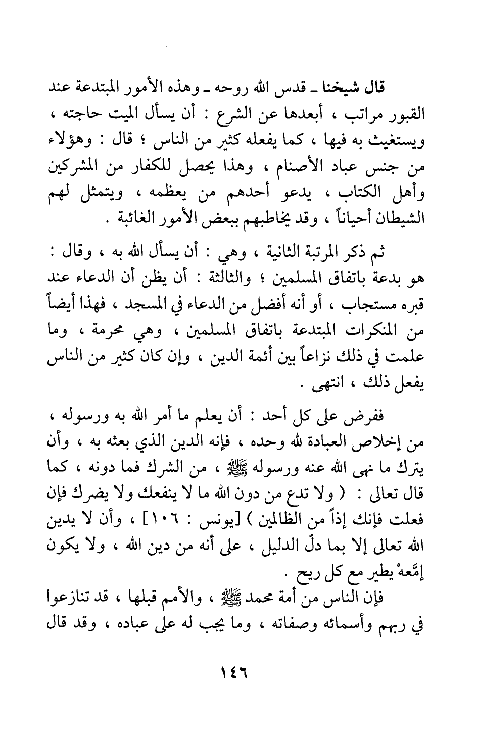 قال شيخنا - قدس الله روحه -: وهذه الأمور المبتدعة عند القبور مراتب: أبعدها عن الشرع: أن يسأل الميت حاجته، ويستغيث به فيها، كما يفعله كثير من الناس; قال: وهؤلاء من جنس عباد الأصنام، وهذا يحصل للكفار من المشركين وأهل الكتاب؛ يدعو أحدهم من يعظمه، ويتمثل لهم الشيطان أحيانا، وقد يخاطبهم ببعض الأمور الغائبة.