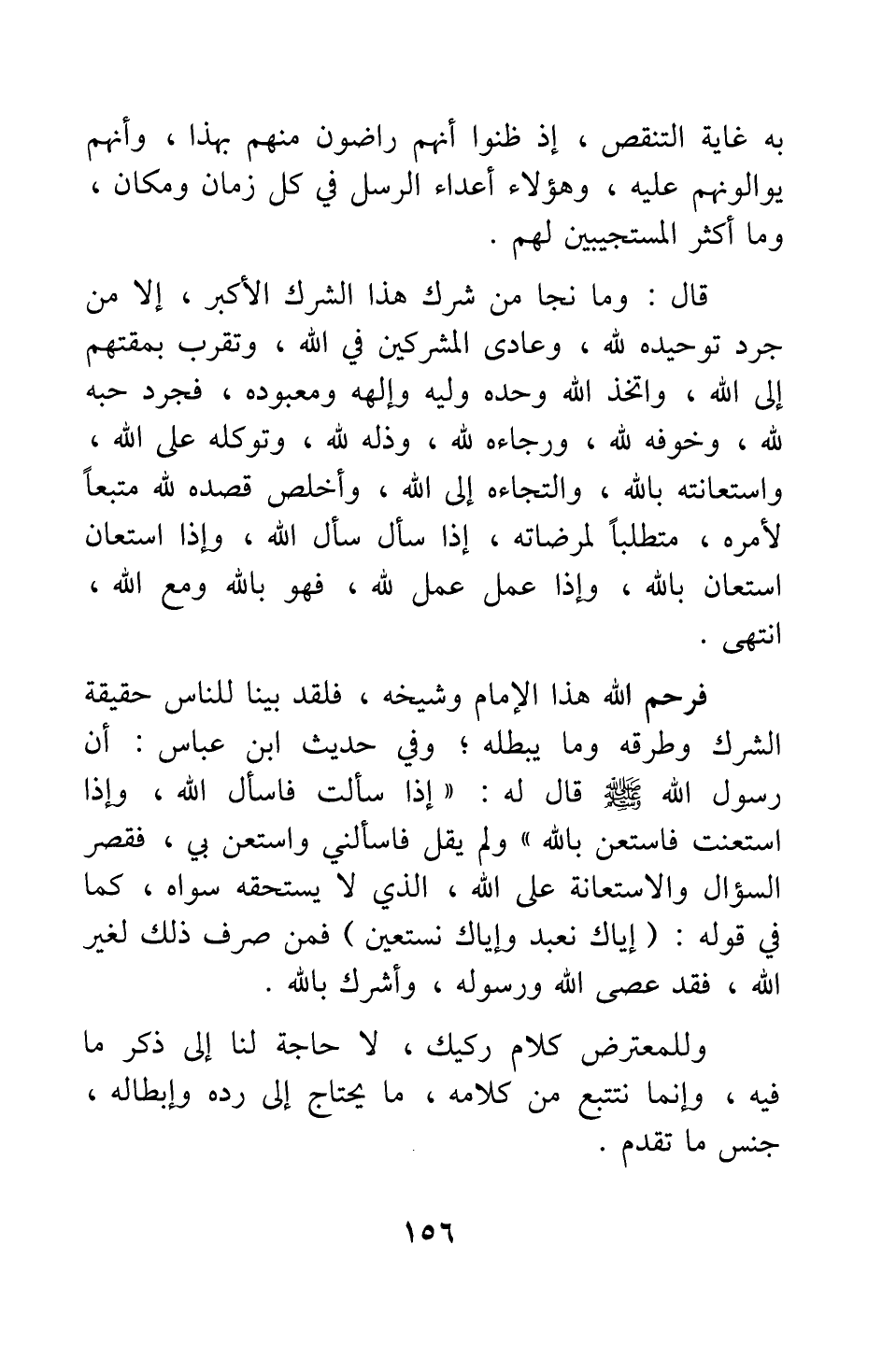 فرحم الله هذا الإمام وشيخه، فلقد بينا للناس حقيقة الشرك وطرقه وما يبطله; وما حديث ابن عباس: أن رسول الله صلى الله عليه وسلم قال له: " إذا سألت فاسأل الله، وإذا استعنت فاستعن بالله " 1، ولم يقل فاسألني واستعن بي، فقصر السؤال والاستعانة على الله الذي لا يستحقه سواه، كما في قوله: {إِيَّاكَ نَعْبُدُ وَإِيَّاكَ نَسْتَعِينُ} [سورة الفاتحة آية: 5] ، فمن صرف ذلك لغير الله، فقد عصى الله ورسوله، وأشرك بالله.
