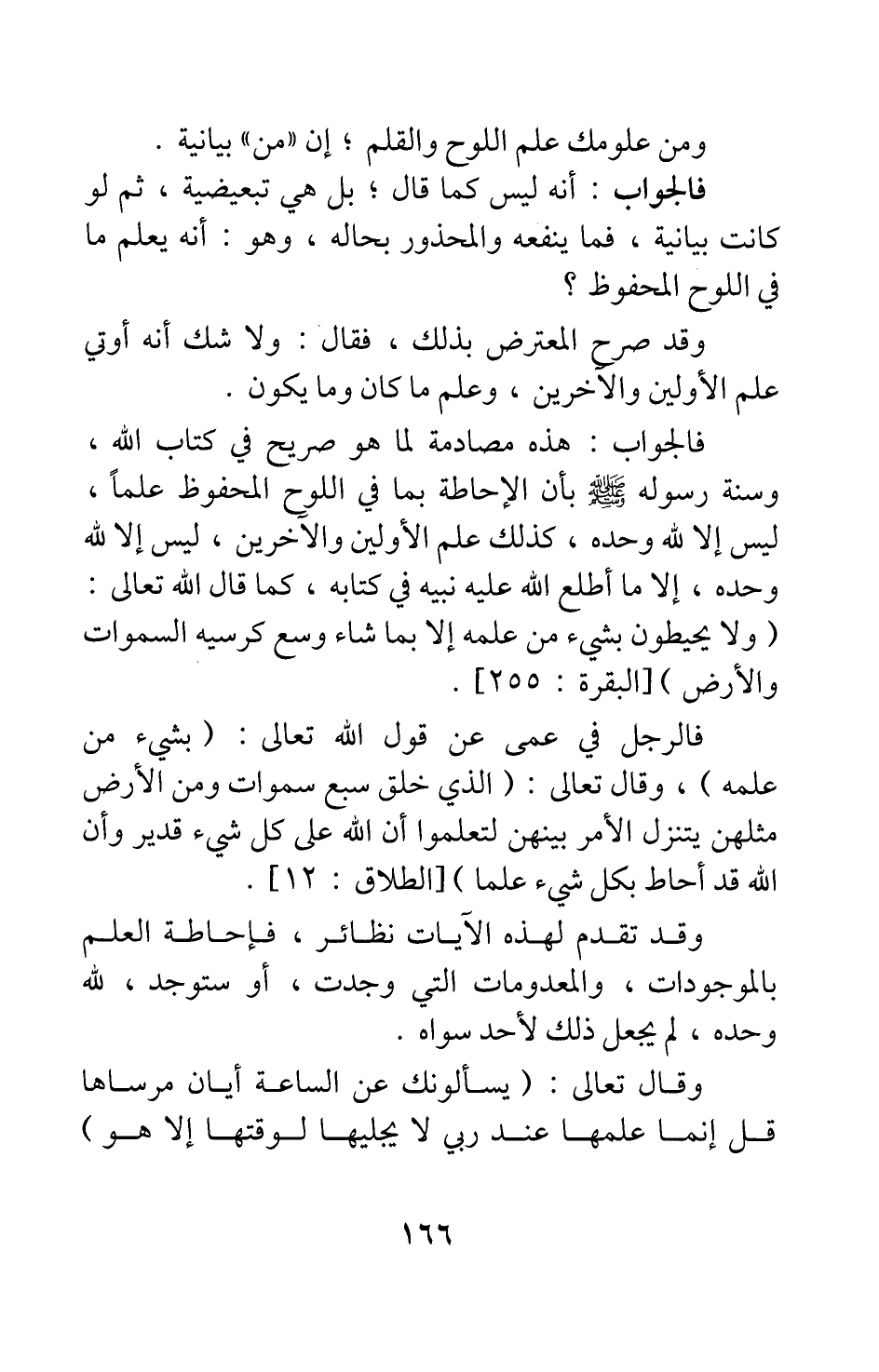 فالجواب: أنه ليس كما قال; بل هي تبعيضية. ثم لو كانت بيانية، فما ينفعه والمحذور بحاله، وهو أنه يعلم ما في اللوح المحفوظ؟