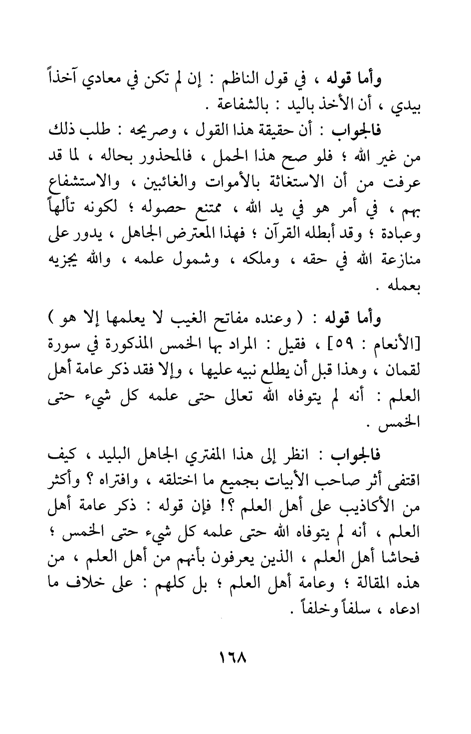 فالجواب: أن حقيقة هذا القول، وصريحه: طلب ذلك من غير الله; فلو صح هذا الحمل، فالمحذور بحاله، لما قد عرفت من أن الاستغاثة بالأموات والغائبين، والاستشفاع بهم، في أمر هو في يد الله، ممتنع حصوله لكونه تألها وعبادة; وقد أبطله القرآن; فهذا المعترض الجاهل، يدور على منازعة الله في حقه، وملكه، وشمول علمه، والله يجزيه بعمله.