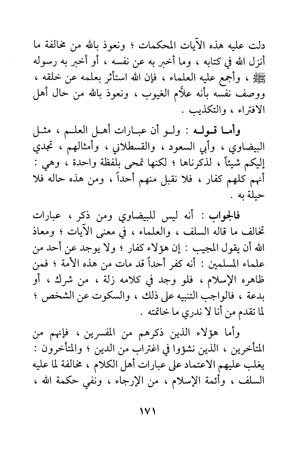فالجواب: أنه ليس للبيضاوي ومن ذكر، عبارات تخالف ما قاله السلف والعلماء في معنى الآيات، ومعاذ الله أن يقول المجيب: إن هؤلاء كفار; ولا يوجد عن أحد من علماء المسلمين أنه كفر أحدا قد مات من هذه الأمة؛ فمن ظاهره الإسلام، فلو وجد في كلامه زلة من شرك، أو بدعة، فالواجب التنبيه على ذلك، والسكوت عن الشخص; لما تقدم من أنا لا ندري ما خاتمته.