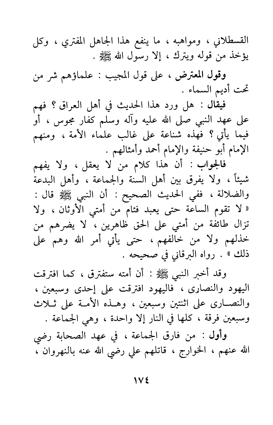 وقول المعترض على قول المجيب: علماؤهم شر من تحت أديم السماء، فيقال: هل ورد هذا الحديث في أهل العراق؟ فهم على عهد النبي صلى الله عليه وآله وسلم كفار مجوس، أو فيما يأتي؟ فهذه شناعة على غالب علماء الأمة؛ ومنهم الإمام أبو حنيفة والإمام أحمد وأمثالهم.