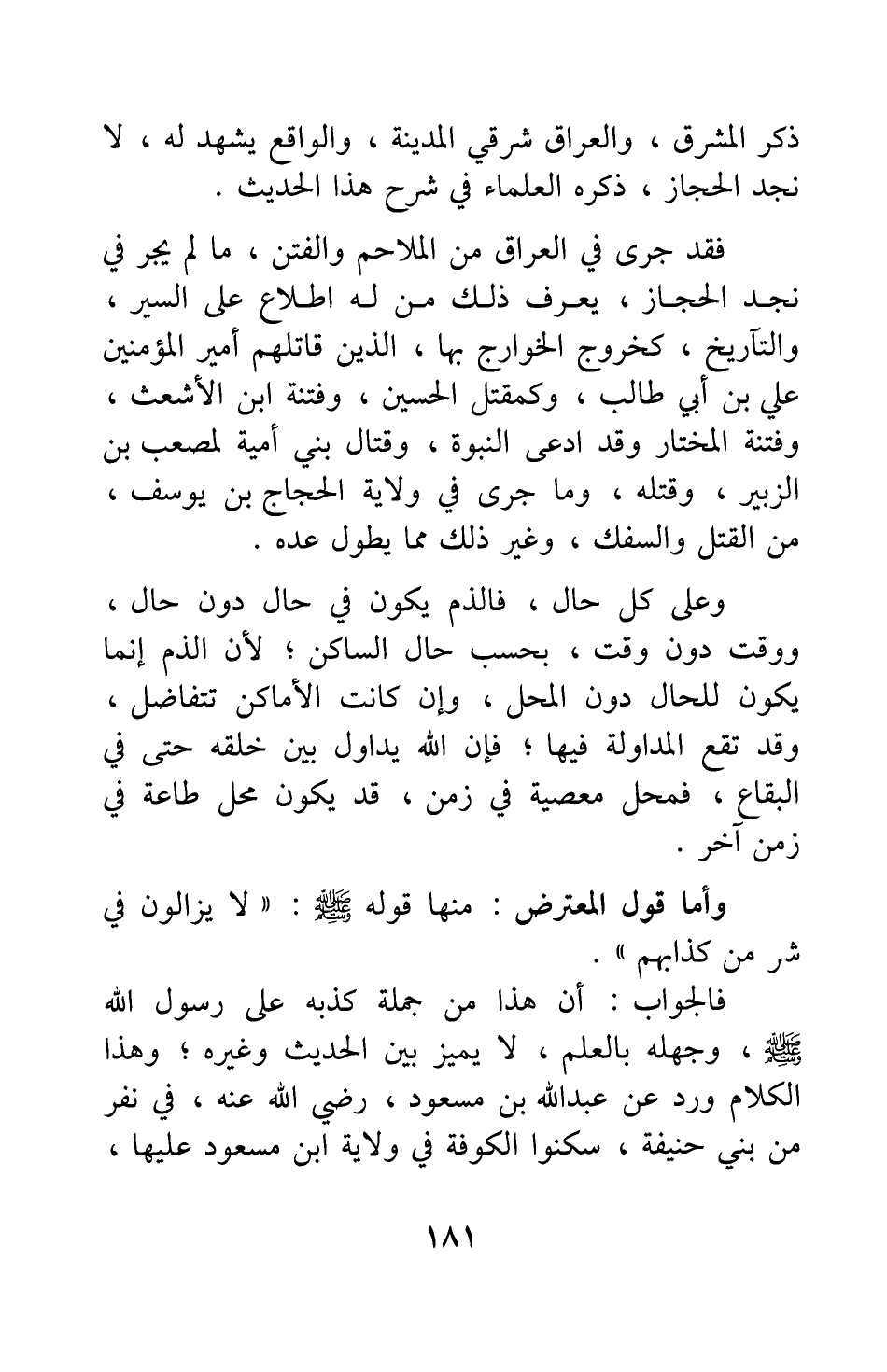 فقد جرى في العراق من الملاحم والفتن، ما لم يجر في نجد الحجاز، يعرف ذلك من له اطلاع على السير، والتاريخ، كخروج الخوارج بها، الذين قاتلهم أمير المؤمنين علي بن أبي طالب، وكمقتل الحسين، وفتنة ابن الأشعث، وفتنة المختار وقد ادعى النبوة، وقتال بني أمية لمصعب بن الزبير، وقتله، وما جرى في ولاية الحجاج بن يوسف، من القتل والسفك، وغير ذلك مما يطول عده.