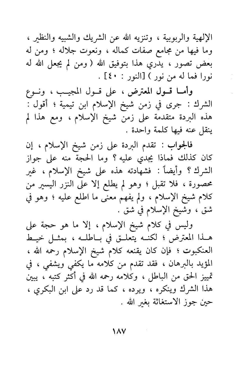 وليس في كلام شيخ الإسلام إلا ما هو حجة على هذا المعترض; لكنه يتعلق في باطله، بمثل خيط العنكبوت; فإن كان يقنعه كلام شيخ الإسلام رحمه الله، المؤيد بالبرهان، فقد تقدم من كلامه ما يكفي ويشفي، في تمييز الحق من الباطل؛ وكلامه رحمه الله في أكثر كتبه، يبين هذا الشرك وينكره، ويرده، كما قد رد على ابن البكري، حين جوز الاستغاثة بغير الله.