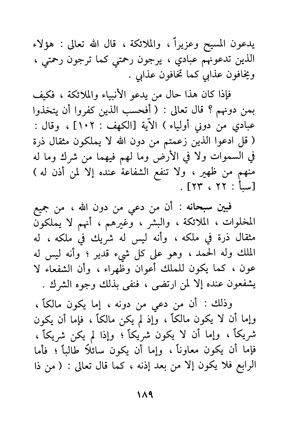فإذا كان هذا حال من يدعو الأنبياء والملائكة، فكيف بمن دونهم؟ قال تعالى: {أَفَحَسِبَ الَّذِينَ كَفَرُوا أَنْ يَتَّخِذُوا عِبَادِي مِنْ دُونِي أَوْلِيَاءَ} [سورة الكهف آية: 102] الآية وقال: {قُلِ ادْعُوا الَّذِينَ زَعَمْتُمْ مِنْ دُونِ اللَّهِ لا يَمْلِكُونَ مِثْقَالَ ذَرَّةٍ فِي السَّمَاوَاتِ وَلا فِي الْأَرْضِ وَمَا لَهُمْ فِيهِمَا مِنْ شِرْكٍ وَمَا لَهُ مِنْهُمْ مِنْ ظَهِيرٍ وَلا تَنْفَعُ الشَّفَاعَةُ عِنْدَهُ إِلَّا لِمَنْ أَذِنَ لَهُ} [سورة سبأ آية: 22-23] .
