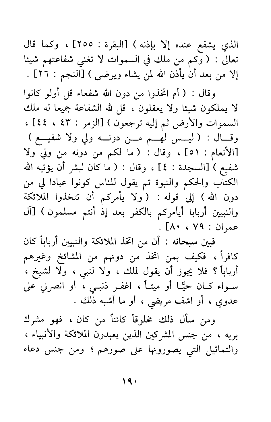 وقال: {أَمِ اتَّخَذُوا مِنْ دُونِ اللَّهِ شُفَعَاءَ قُلْ أَوَلَوْ كَانُوا لا يَمْلِكُونَ شَيْئاً وَلا يَعْقِلُونَ قُلْ لِلَّهِ الشَّفَاعَةُ جَمِيعاً لَهُ مُلْكُ السَّمَاوَاتِ وَالْأَرْضِ ثُمَّ إِلَيْهِ تُرْجَعُونَ} [سورة الزمر آية: 43-44] ، وقال: {لَيْسَ لَهُمْ مِنْ دُونِهِ وَلِيٌّ وَلا شَفِيعٌ} [سورة الأنعام آية: 51] وقال: {مَا لَكُمْ مِنْ دُونِهِ مِنْ وَلِيٍّ وَلا شَفِيعٍ} [سورة السجدة آية: 4] ، وقال: {مَا كَانَ لِبَشَرٍ أَنْ يُؤْتِيَهُ اللَّهُ الْكِتَابَ وَالْحُكْمَ وَالنُّبُوَّةَ ثُمَّ يَقُولَ لِلنَّاسِ كُونُوا عِبَاداً لِي مِنْ دُونِ اللَّهِ} [سورة آل عمران آية: 79] إلى قوله: {وَلا يَأْمُرَكُمْ أَنْ تَتَّخِذُوا الْمَلائِكَةَ وَالنَّبِيِّينَ أَرْبَاباً أَيَأْمُرُكُمْ بِالْكُفْرِ بَعْدَ إِذْ أَنْتُمْ مُسْلِمُونَ} [سورة آل عمران آية: 80] .