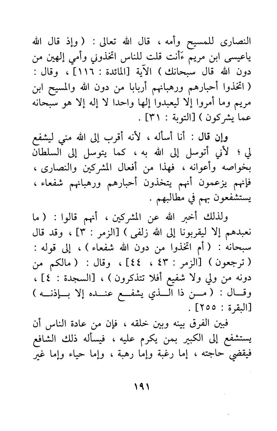 ولذلك أخبر الله عن المشركين، أنهم قالوا: {مَا نَعْبُدُهُمْ إِلَّا لِيُقَرِّبُونَا إِلَى اللَّهِ زُلْفَى} [سورة الزمر آية: 3] ، وقد قال سبحانه: {أَمِ اتَّخَذُوا مِنْ دُونِ اللَّهِ شُفَعَاءَ} [سورة الزمر آية: 43] إلى قوله: {تُرْجَعُونَ} ، وقال: {مَا لَكُمْ مِنْ دُونِهِ مِنْ وَلِيٍّ وَلا شَفِيعٍ أَفَلا تَتَذَكَّرُونَ} [سورة السجدة آية: 4] ، وقال: {مَنْ ذَا الَّذِي يَشْفَعُ عِنْدَهُ إِلَّا بِإِذْنِهِ} [سورة البقرة آية: 255] .