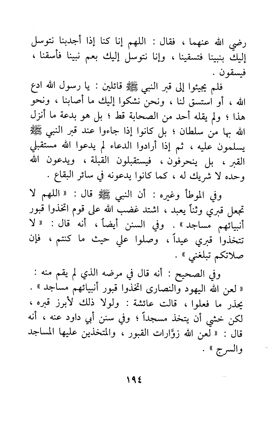 وفي الموطأ وغيره: أن النبي صلى الله عليه وسلم قال: " اللهم لا تجعل قبري وثنا يعبد. اشتد غضب الله على قوم اتخذوا قبور أنبيائهم مساجد " 1.