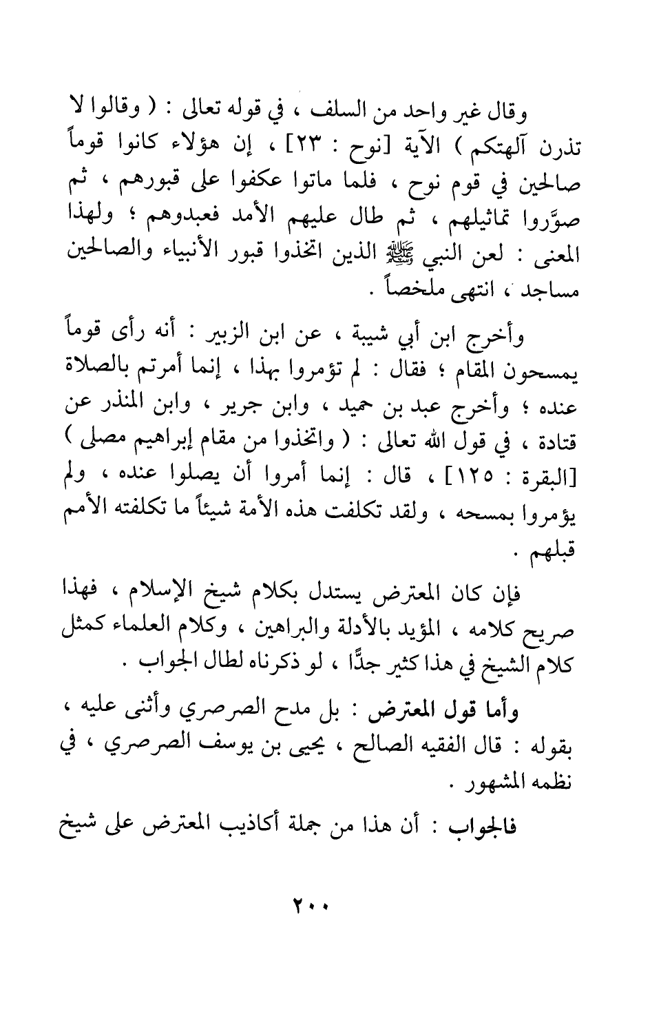 وأخرج ابن أبي شيبة، عن ابن الزبير: أنه رأى قوما يمسحون المقام; فقال: لم تؤمروا بهذا، إنما أمرتم بالصلاة عنده. وأخرج عبد بن حميد، وابن جرير، وابن المنذر عن قتادة، في قول الله تعالى: {وَاتَّخِذُوا مِنْ مَقَامِ إِبْرَاهِيمَ مُصَلّىً} [سورة البقرة آية: 125] قال: إنما أمروا أن يصلوا عنده، ولم يؤمروا بمسحه؛ ولقد تكلفت هذه الأمة شيئا ما تكلفته الأمم قبلهم. فإن كان المعترض يستدل بكلام شيخ الإسلام، فهذا صريح كلامه، المؤيد بالأدلة والبراهين. وكلام العلماء كمثل كلام الشيخ في هذا كثير جدا؛ لو ذكرناه لطال الجواب.