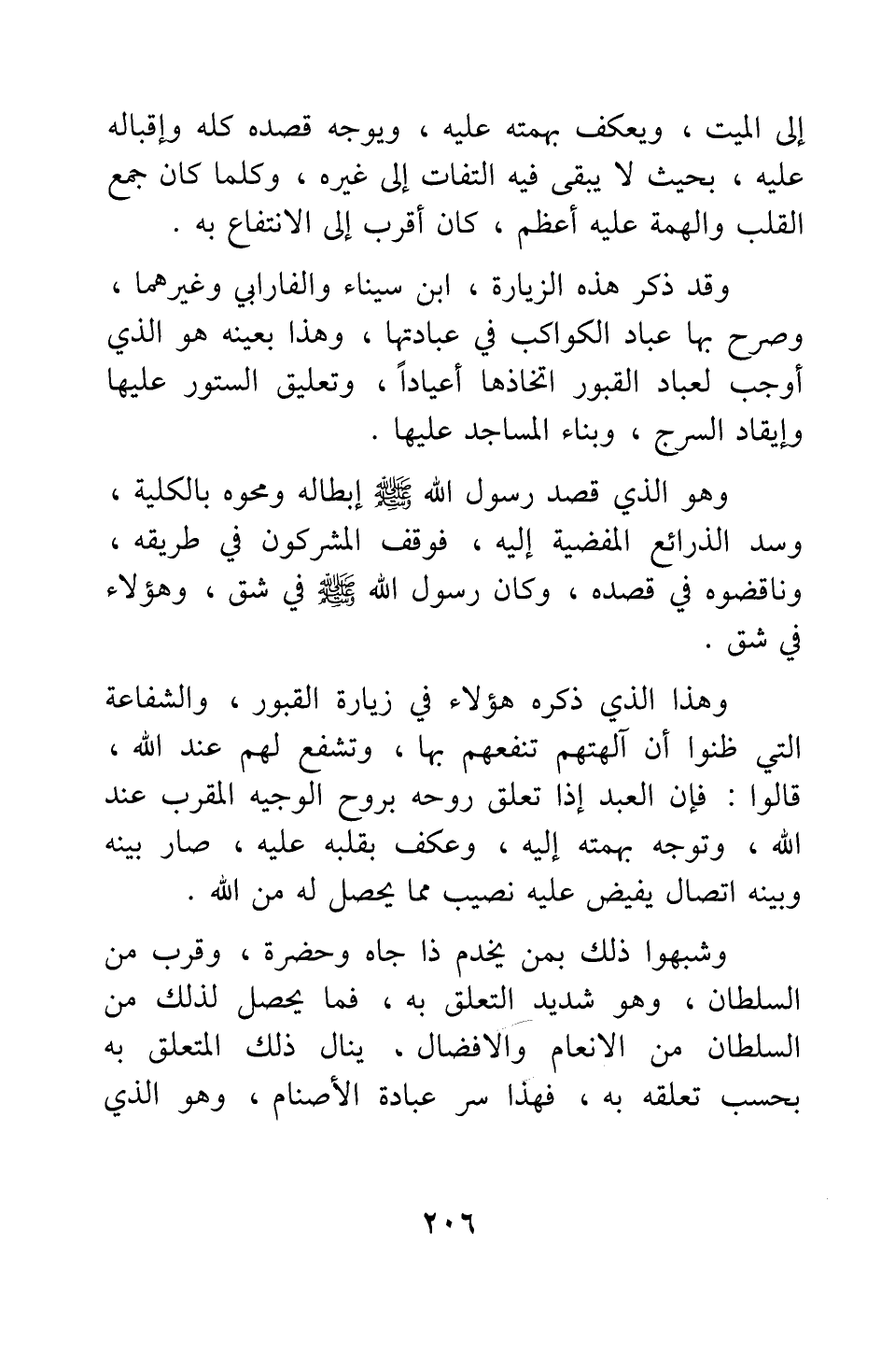 وقد ذكر هذه الزيارة ابن سينا والفارابي وغيرهما، وصرح بها عباد الكواكب في عبادتها؛ وهذا بعينه هو الذي أوجب لعباد القبور اتخاذها أعيادا، وتعليق الستور عليها وإيقاد السرج، وبناء المساجد عليها.