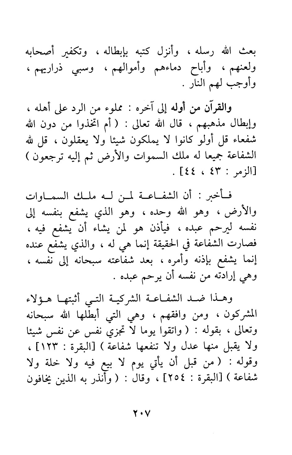 والقرآن من أوله إلى آخره: مملوء من الرد على أهله، وإبطال مذهبهم، قال الله تعالى: {أَمِ اتَّخَذُوا مِنْ دُونِ اللَّهِ شُفَعَاءَ قُلْ أَوَلَوْ كَانُوا لا يَمْلِكُونَ شَيْئاً وَلا يَعْقِلُونَ قُلْ لِلَّهِ الشَّفَاعَةُ جَمِيعاً لَهُ مُلْكُ السَّمَاوَاتِ وَالْأَرْضِ ثُمَّ إِلَيْهِ تُرْجَعُونَ} [سورة الزمر آية: 43-44] ، فأخبر أن الشفاعة لمن له ملك السماوات والأرض، وهو الله وحده، وهو الذي يشفع بنفسه إلى نفسه ليرحم عبده، فيأذن هو لمن يشاء أن يشفع فيه؛ فصارت الشفاعة في الحقيقة إنما هي له، والذي يشفع عنده إنما يشفع بإذنه وأمره، بعد شفاعته سبحانه إلى نفسه، وهي إرادته من نفسه أن يرحم عبده.