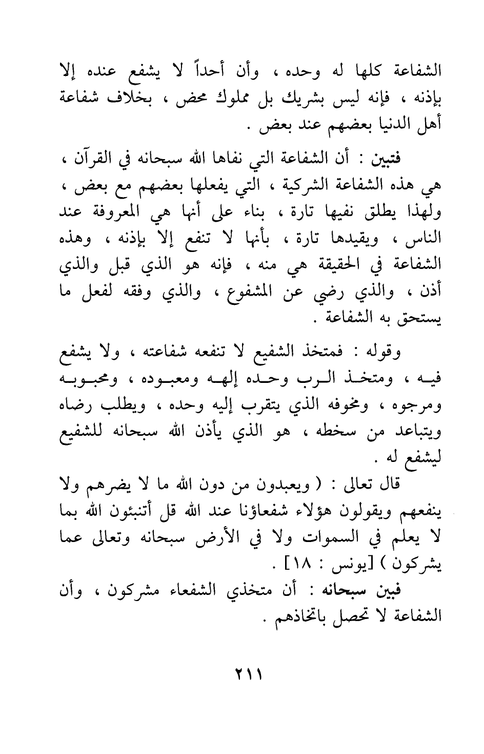 فتبين أن الشفاعة التي نفاها الله سبحانه في القرآن، هي هذه الشفاعة الشركية، التي يفعلها بعضهم مع بعض؛ ولهذا يطلق نفيها تارة، بناء على أنها هي المعروفة عند الناس، ويقيدها تارة، بأنها لا تنفع إلا بإذنه. وهذه الشفاعة في الحقيقة هي منه؛ فإنه هو الذي قبل والذي أذن، والذي رضي عن المشفوع، والذي وفقه لفعل ما يستحق به الشفاعة.