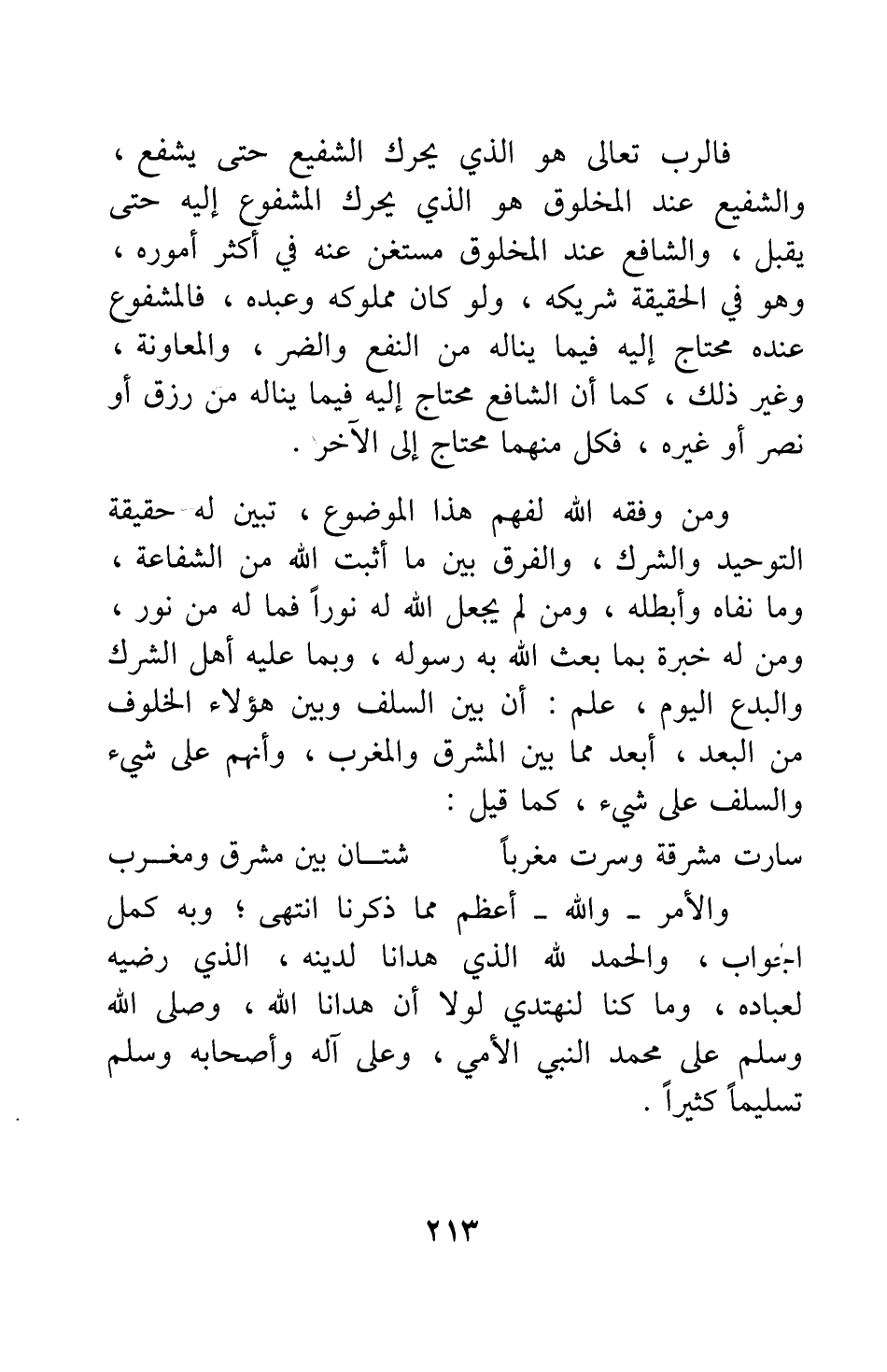 فالرب تعالى هو الذي يحرك الشفيع حتى يشفع، والشفيع عند المخلوق هو الذي يحرك المشفوع إليه حتى يقبل. والشافع عند المخلوق مستغن عنه في أكثر أموره، وهو في الحقيقة شريكه، ولو كان مملوكه وعبده؛ فالمشفوع عنده محتاج إليه فيما يناله من النفع والضر، والمعاونة، وغير ذلك، كما أن الشافع محتاج إليه فيما يناله من رزق أو نصر أو غيره؛ فكل منهما محتاج إلى الآخر. ومن وفقه الله لفهم هذا الموضوع، تبين له حقيقة التوحيد والشرك، والفرق بين ما أثبت الله من الشفاعة، وما نفاه وأبطله، {ومن لم يجعل الله له نورا فما له من نور} ، ومن له خبرة بما بعث الله به رسوله، وبما عليه أهل الشرك والبدع اليوم، علم أن بين السلف وبين هؤلاء الخلوف من البعد، أبعد مما بين المشرق والمغرب، وأنهم على شيء والسلف على شيء، كما قيل: