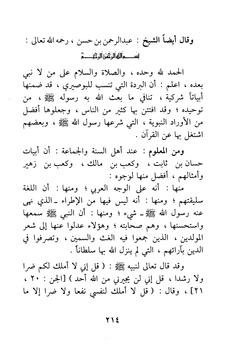 [ما قاله الشيخ عبد الرحمن بن حسن في بردة البوصيري]