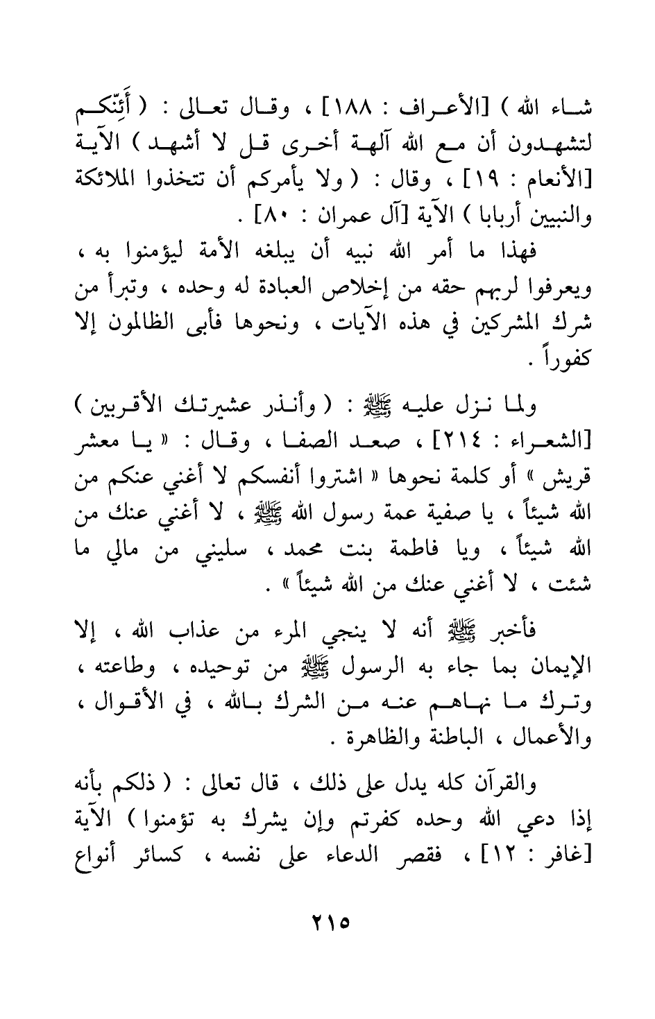 وقال تعالى: {أَإِنَّكُمْ لَتَشْهَدُونَ أَنَّ مَعَ اللَّهِ آلِهَةً أُخْرَى قُلْ لا أَشْهَدُ} [سورة الأنعام آية: 19] الآية، وقال: {وَلا يَأْمُرَكُمْ أَنْ تَتَّخِذُوا الْمَلائِكَةَ وَالنَّبِيِّينَ أَرْبَاباً} [سورة آل عمران آية: 80] الآية. فهذا ما أمر الله نبيه أن يبلغه الأمة ليؤمنوا به، ويعرفوا لربهم حقه من إخلاص العبادة له وحده؛ وتبرأ من شرك المشركين في هذه الآيات، ونحوها فأبى الظالمون إلا كفورا.
