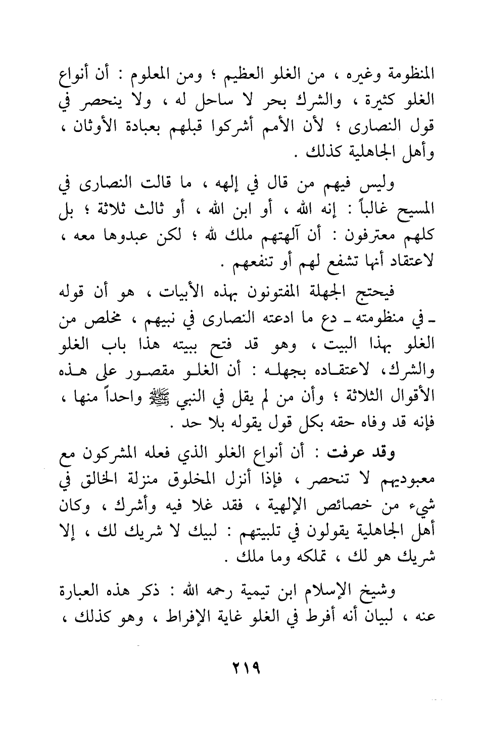 وليس فيهم من قال في إلهه ما قالت النصارى في المسيح غالبا: إنه الله، أو ابن الله، أو ثالث ثلاثة؛ بل كلهم معترفون أن آلهتهم ملك لله، لكن عبدوها معه، لاعتقاد أنها تشفع لهم أو تنفعهم. فيحتج الجهلة المفتونون بهذه الأبيات، هو أن قوله - في منظومته- دع ما ادعته النصارى في نبيهم، مخلص من الغلو بهذا البيت؛ وهو قد فتح ببيته هذا باب الغلو والشرك، لاعتقاده بجهله أن الغلو مقصور على هذه الأقوال الثلاثة، وأن من لم يقل في النبي واحدا منها، فإنه قد وفاه حقه بكل قول يقوله بلا حد.