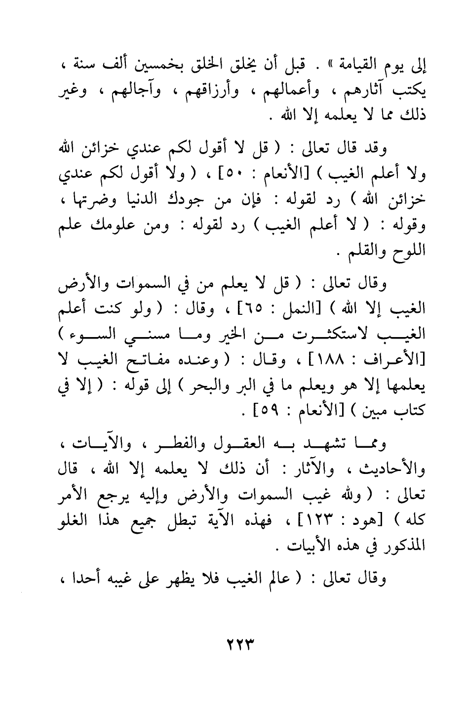 ومما تشهد به العقول والفطر، والآيات والأحاديث والآثار أن ذلك لا يعلمه إلا الله، قال تعالى: {وَلِلَّهِ غَيْبُ السَّمَاوَاتِ وَالْأَرْضِ وَإِلَيْهِ يُرْجَعُ الْأَمْرُ كُلُّهُ} [سورة هود آية: 123] فهذه الآية تبطل جميع هذا الغلو المذكور في هذه الأبيات.