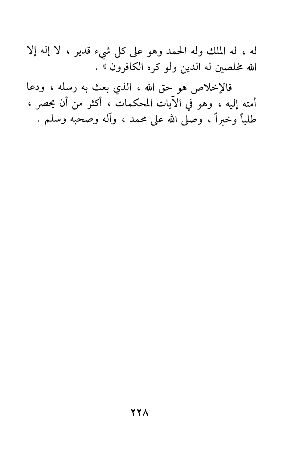 له، له الملك وله الحمد وهو على كل شيء قدير، لا إله إلا الله مخلصين له الدين ولو كره الكافرون ". فالإخلاص هو حق الله، الذي بعث به رسله، ودعا أمته إليه، وهو في الآيات المحكمات، أكثر من أن يحصر، طلبا وخبرا، وصلى الله على محمد، وآله وصحبه وسلم