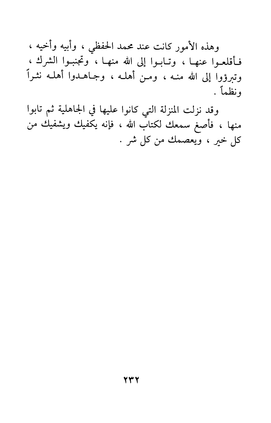 وهذه الأمور كانت عند محمد الحفظي، وأبيه وأخيه، فأقلعوا عنها، وتابوا إلى الله منها، وتجنبوا الشرك، وتبرؤوا إلى الله منه ومن أهله، وجاهدوا أهله نثرا ونظما. وقد نزلت المنْزلة التي كانوا عليها في الجاهلية ثم تابوا منها، فأصغ سمعك لكتاب الله؛ فإنه يكفيك ويشفيك من كل خير، ويعصمك من كل شر.