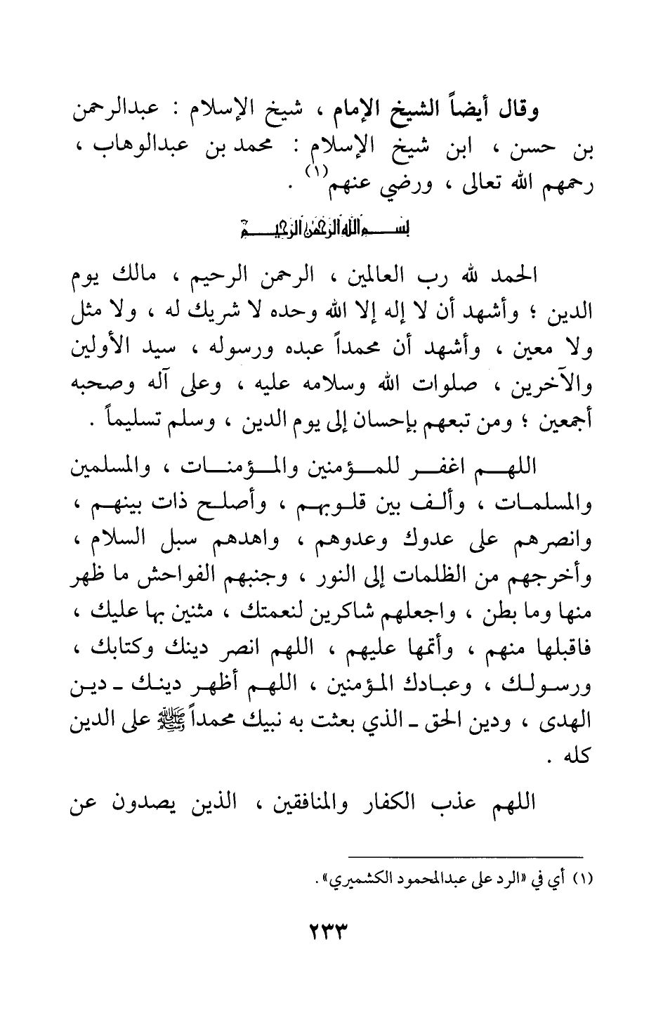 وقال أيضا الشيخ الإمام، شيخ الإسلام عبد الرحمن بن حسن، ابن شيخ الإسلام محمد بن عبد الوهاب، رحمهم الله تعالى، ورضي عنهم 1. بسم الله الرحمن الرحيم
