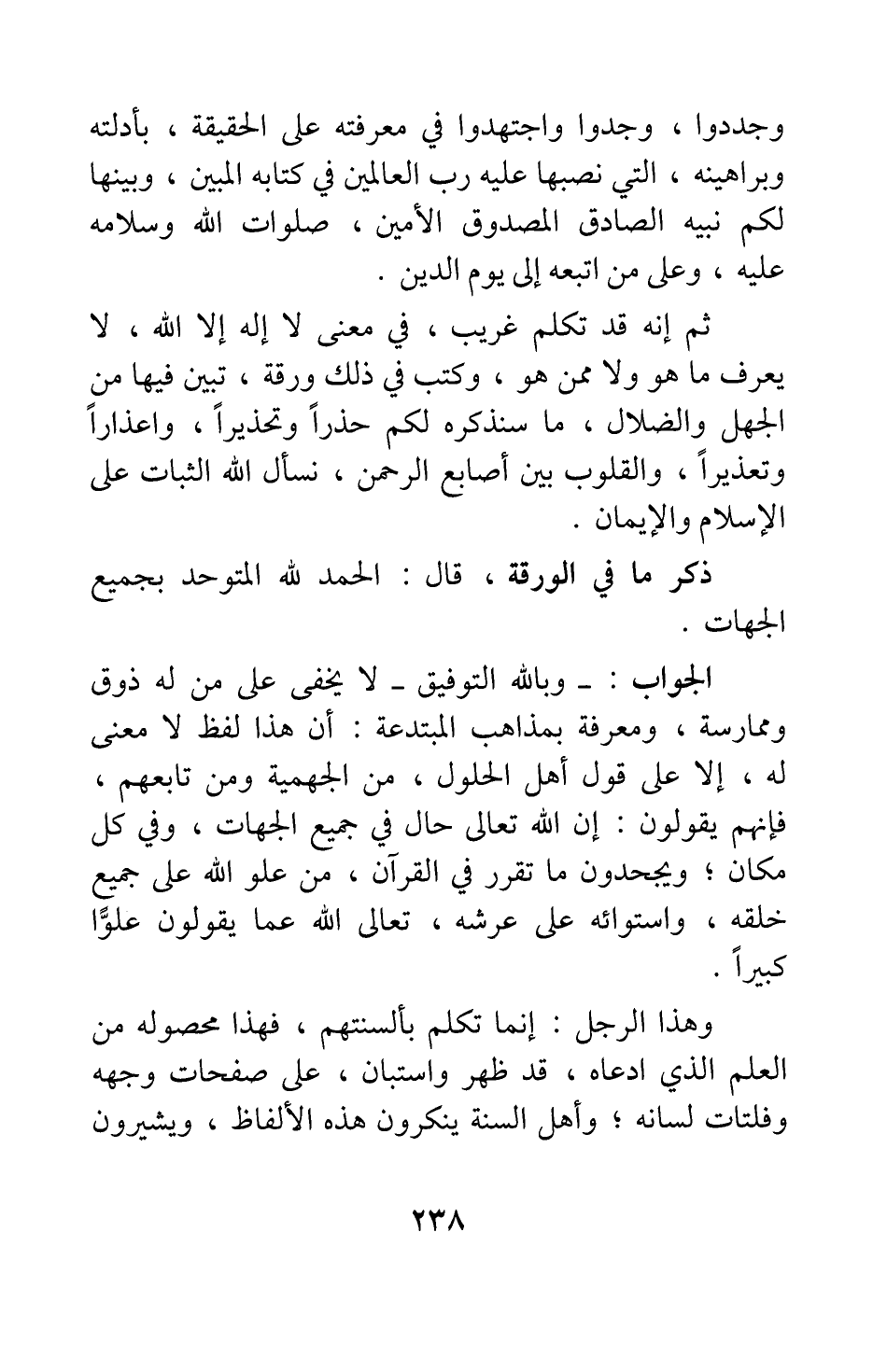ثم إنه قد تكلم غريب، في معنى لا إله إلا الله، لا يعرف ما هو ولا ممن هو، وكتب في ذلك ورقة، تبين فيها من الجهل والضلال، ما سنذكره لكم حذرا وتحذيرا، واعذارا وتعذيرا؛ والقلوب بين أصابع الرحمن، نسأل الله الثبات على الإسلام والإيمان.