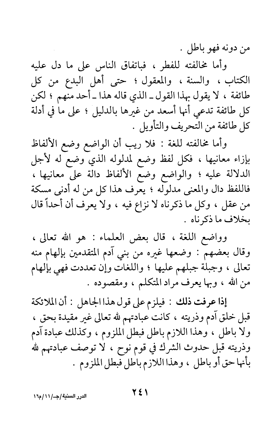 إذا عرفت ذلك، فيلزم على قول هذا الجاهل أن الملائكة قبل خلق آدم وذريته كانت عبادتهم لله تعالى غير مقيدة بحق ولا باطل؛ وهذا اللازم باطل فبطل الملزوم، وكذلك عبادة آدم وذريته قبل حدوث الشرك في قوم نوح، لا توصف عبادتهم لله بأنها حق أو باطل؛ وهذا اللازم باطل فبطل الملزوم.