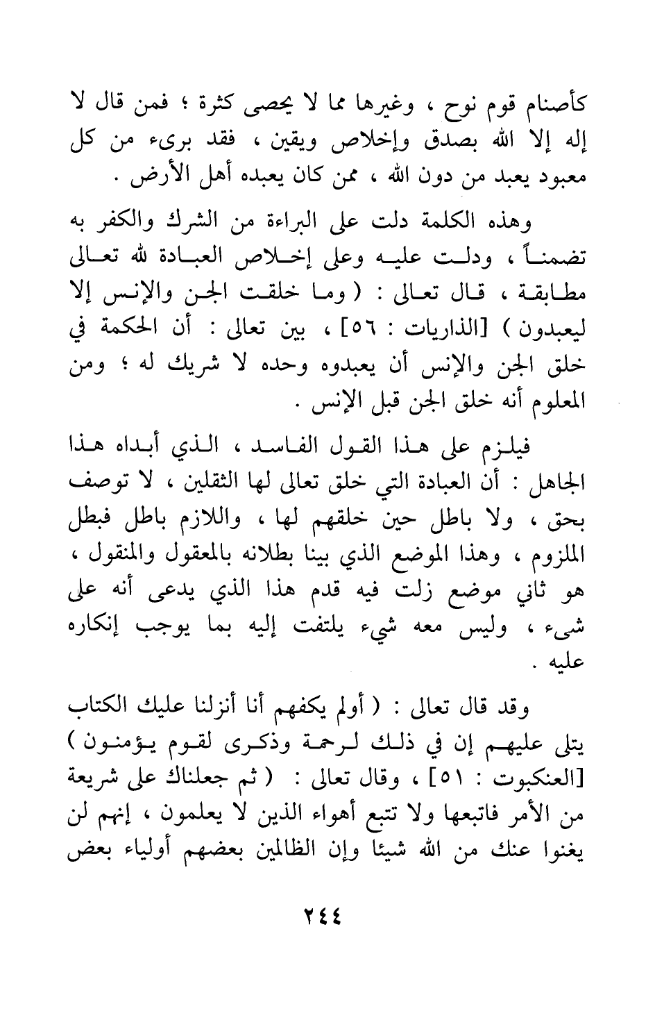 وهذه الكلمة دلت على البراءة من الشرك والكفر به تضمنا، ودلت عليه وعلى إخلاص العبادة لله تعالى مطابقة، قال تعالى: {وَمَا خَلَقْتُ الْجِنَّ وَالْأِنْسَ إِلَّا لِيَعْبُدُونِ} [سورة الذاريات آية: 56] . بين تعالى أن الحكمة في خلق الجن والإنس أن يعبدوه وحده لا شريك له، ومن المعلوم أنه خلق الجن قبل الإنس.