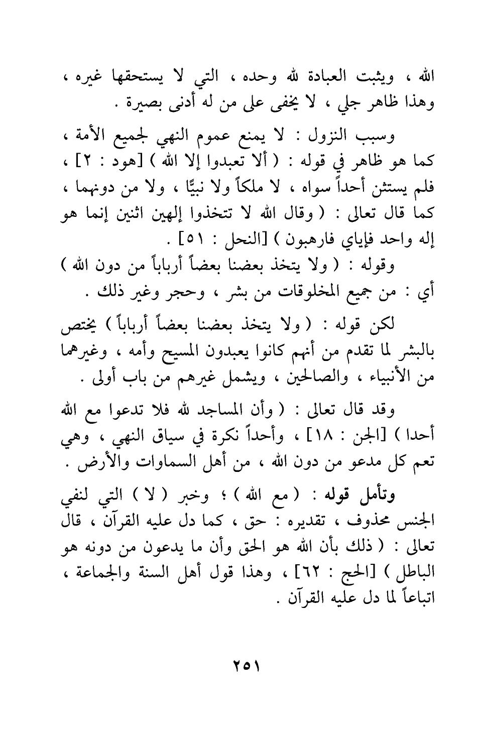 لكن قوله: {وَلا يَتَّخِذَ بَعْضُنَا بَعْضاً أَرْبَاباً} [سورة آل عمران آية: 64] يختص بالبشر لما تقدم من أنهم كانوا يعبدون المسيح وأمه، وغيرهما من الأنبياء والصالحين، ويشمل غيرهم من باب أولى. وقد قال تعالى: {وَأَنَّ الْمَسَاجِدَ لِلَّهِ فَلا تَدْعُو مَعَ اللَّهِ أَحَداً} [سورة الجن آية: 18] ، وأحدا: نكرة في سياق النهي، وهي تعم كل مدعو من دون الله، من أهل السماوات والأرض.