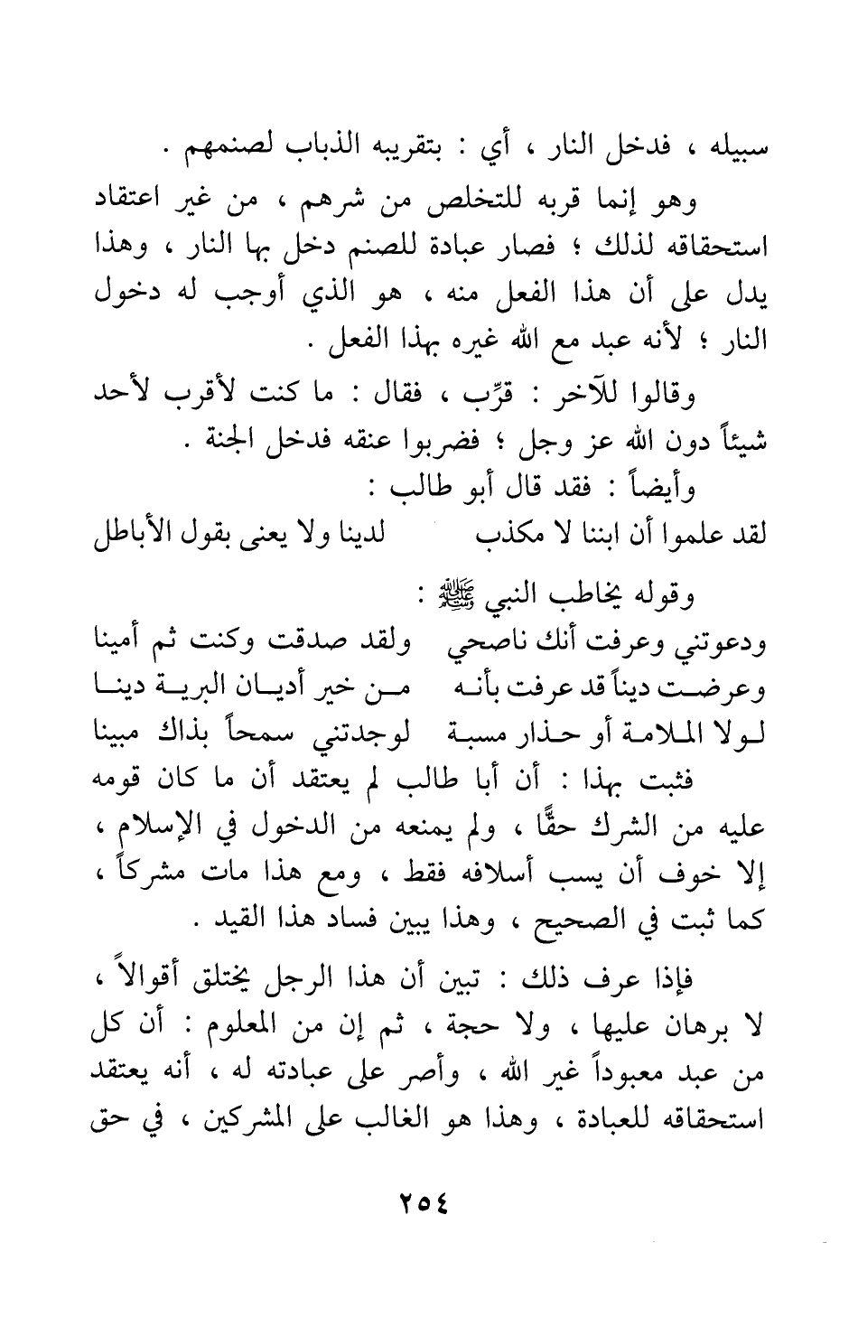 فثبت بهذا: أن أبا طالب لم يعتقد أن ما كان قومه عليه من الشرك حقا، ولم يمنعه من الدخول في الإسلام، إلا خوف أن يسب أسلافه فقط، ومع هذا مات مشركا، كما ثبت في الصحيح؛ وهذا يبين فساد هذا القيد.