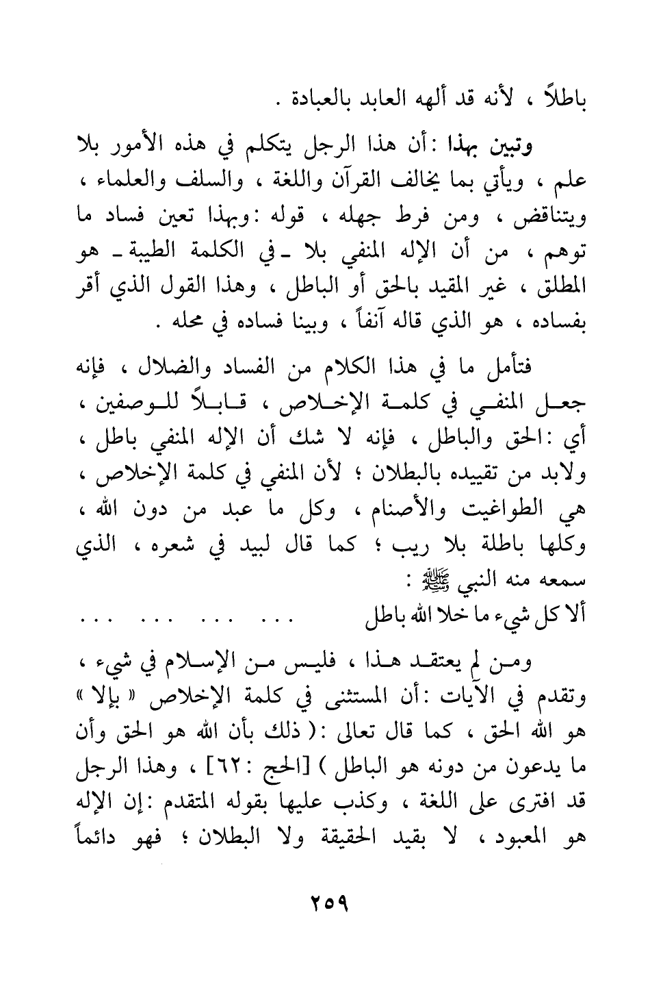 فتأمل ما في هذا الكلام من الفساد والضلال، فإنه جعل المنفي في كلمة الإخلاص، قابلا للوصفين، أي: الحق والباطل؛ فإنه لا شك أن الإله المنفي باطل، ولا بد من تقييده بالبطلان، لأن المنفي في كلمة الإخلاص، هي الطواغيت والأصنام، وكل ما عبد من دون الله؛ وكلها باطلة بلا ريب، كما قال لبيد في شعره، الذي سمعه منه النبي صلى الله عليه وسلم: