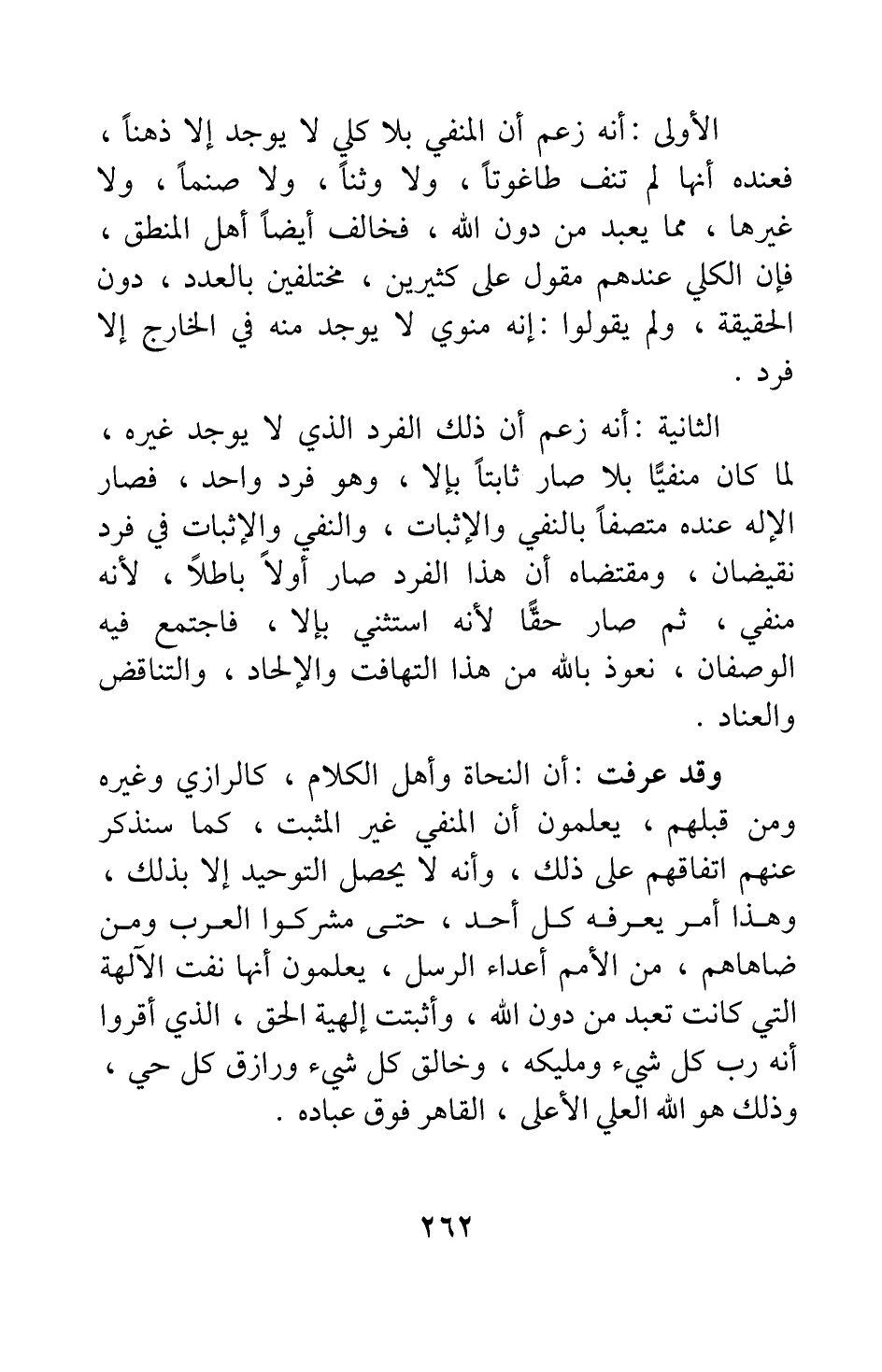 الثانية: أنه زعم أن ذلك الفرد الذي لا يوجد غيره، لما كان منفيا بلا صار ثابتا بإلا، وهو فرد واحد؛ فصار الإله عنده متصفا بالنفي والإثبات. والنفي والإثبات في فرد نقيضان، ومقتضاه أن هذا الفرد صار أولا باطلا لأنه منفي، ثم صار حقا لأنه استثني بإلا؛ فاجتمع فيه الوصفان، نعوذ بالله من هذا التهافت والإلحاد، والتناقض والعناد. وقد عرفت أن النحاة وأهل الكلام،، كالرازي وغيره ومن قبلهم، يعلمون أن المنفي غير المثبت، كما سنذكر عنهم اتفاقهم على ذلك، وأنه لا يحصل التوحيد إلا بذلك؛ وهذا أمر يعرفه كل أحد، حتى مشركو العرب ومن ضاهاهم، من الأمم أعداء الرسل، يعلمون أنها نفت الآلهة التي كانت تعبد من دون الله، وأثبتت إلهية الحق الذي أقروا أنه رب كل شيء ومليكه، وخالق كل شيء ورازق كل حي، وذلك هو الله العلي الأعلى، القاهر فوق عباده.
