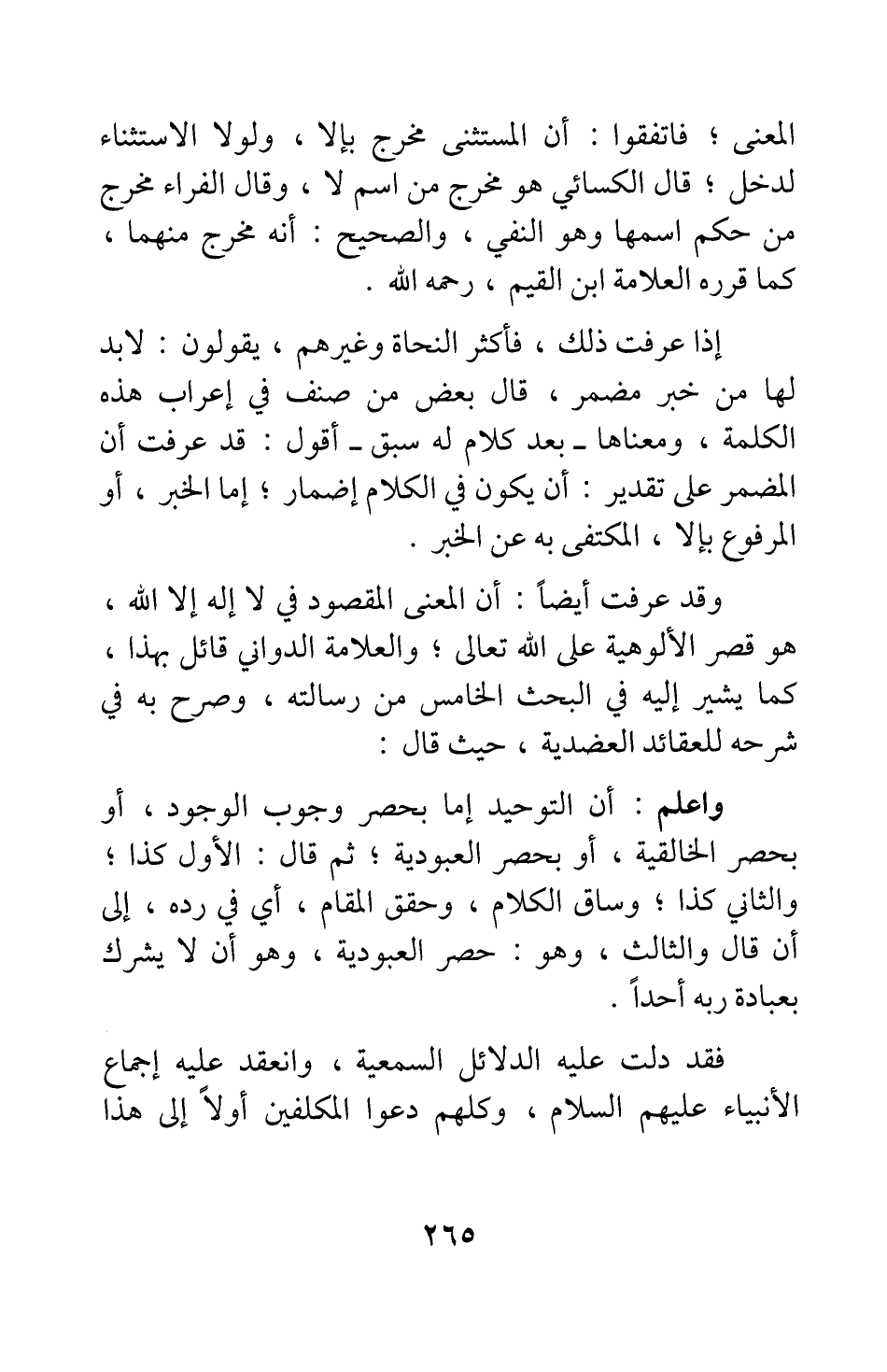 وقد عرفت أيضا أن المعنى المقصود في لا إله إلا الله، هو قصر الألوهية على الله تعالى؛ والعلامة الدواني قائل بهذا، كما يشير إليه في البحث الخامس من رسالته، وصرح به في شرحه للعقائد العضدية، حيث قال: