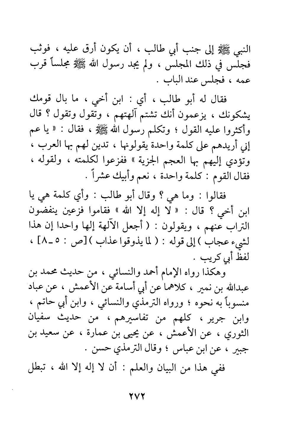 فقال له أبو طالب: أي ابن أخي، ما بال قومك يشكونك؟ يزعمون أنك تشتم آلهتهم، وتقول وتقول؟ قال: وأكثروا عليه القول، وتكلم رسول الله صلى الله عليه وسلم فقال: "?يا عم إني أريدهم على كلمة واحدة يقولونها، تدين لهم بها العرب، وتؤدي إليهم بها العجم الجزية" ففزعوا لكلمته، ولقوله، فقال القوم: كلمة واحدة، نعم وأبيك عشرا.