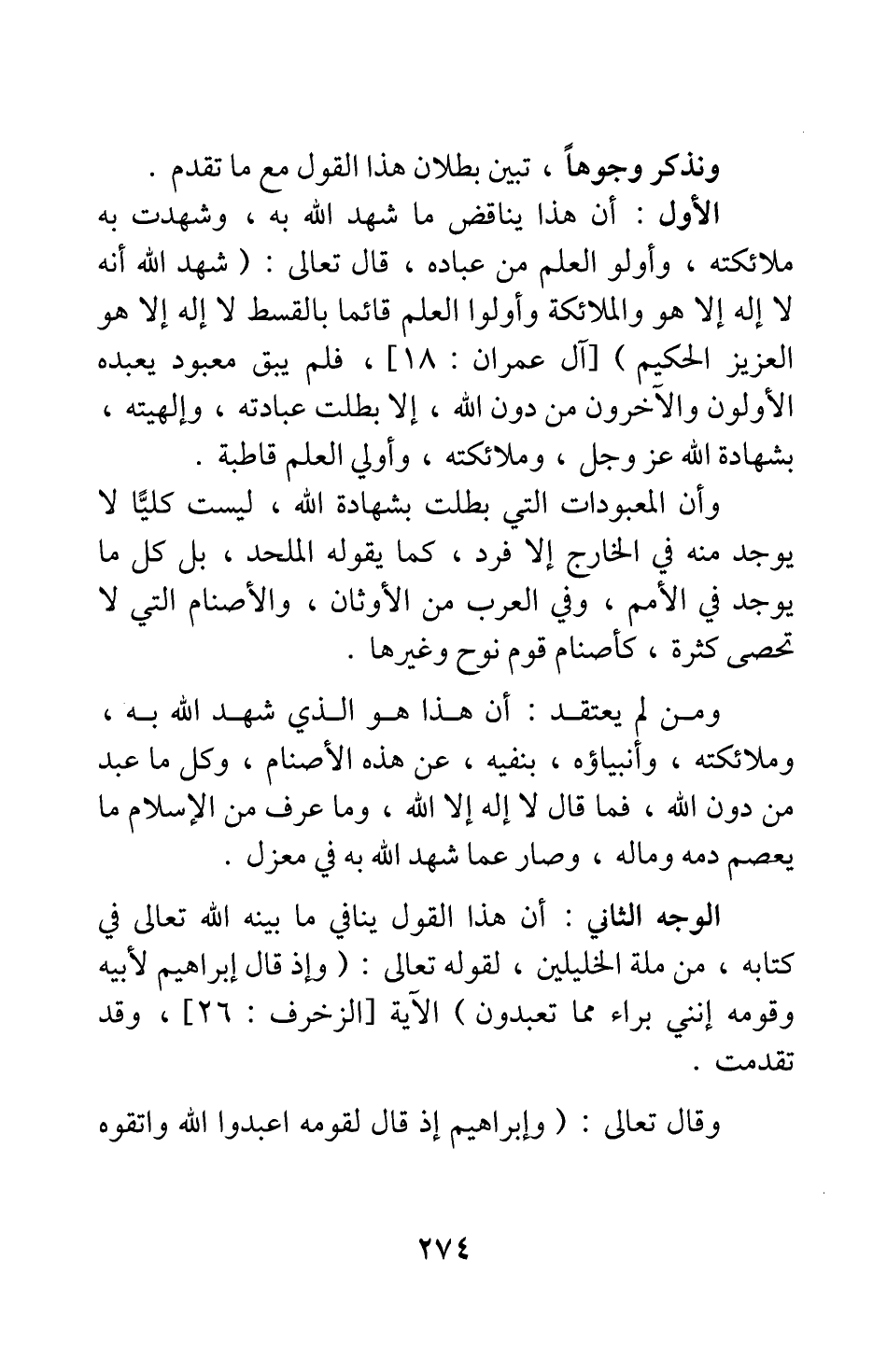 الأول: أن هذا يناقض ما شهد الله به، وشهدت به ملائكته، وأولو العلم من عباده، قال تعالى: {شَهِدَ اللَّهُ أَنَّهُ لا إِلَهَ إِلَّا هُوَ وَالْمَلائِكَةُ وَأُولُو الْعِلْمِ قَائِماً بِالْقِسْطِ لا إِلَهَ إِلَّا هُوَ الْعَزِيزُ الْحَكِيمُ} [سورة آل عمران آية: 18] ؛ فلم يبق معبود يعبده الأولون والآخرون من دون الله، إلا بطلت عبادته، وإلهيته، بشهادة الله عز وجل وملائكته، وأولي العلم قاطبة. وأن المعبودات التي بطلت بشهادة الله، ليست كليا لا يوجد منه في الخارج إلا فرد، كما يقوله الملحد، بل كل ما يوجد في الأمم، وفي العرب من الأوثان، والأصنام التي لا تحصى كثرة، كأصنام قوم نوح وغيرها. ومن لم يعتقد أن هذا هو الذي شهد الله به، وملائكته، وأنبياؤه، بنفي، عن هذه الأصنام، وكل ما عبد من دون الله، فما قال لا إله إلا الله، وما عرف من الإسلام ما يعصم دمه وماله، وصار عما شهد الله به في معزل.