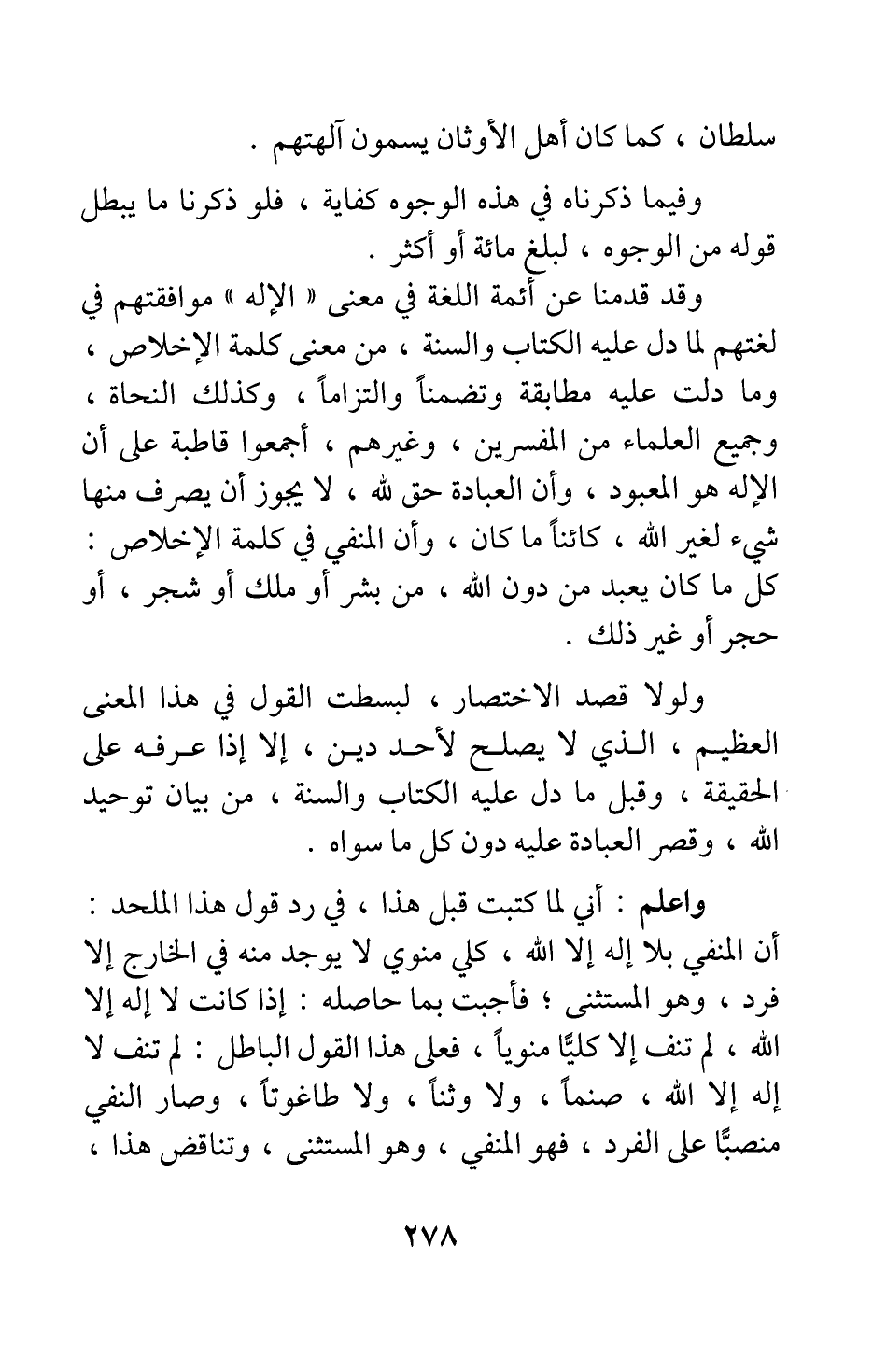 ولولا قصد الاختصار، لبسطت القول في هذا المعنى العظيم، الذي لا يصلح لأحد دين، إلا إذا عرفه على الحقيقة، وقبل ما دل عليه الكتاب والسنة، من بيان توحيد الله، وقصر العبادة عليه دون كل ما سواه.