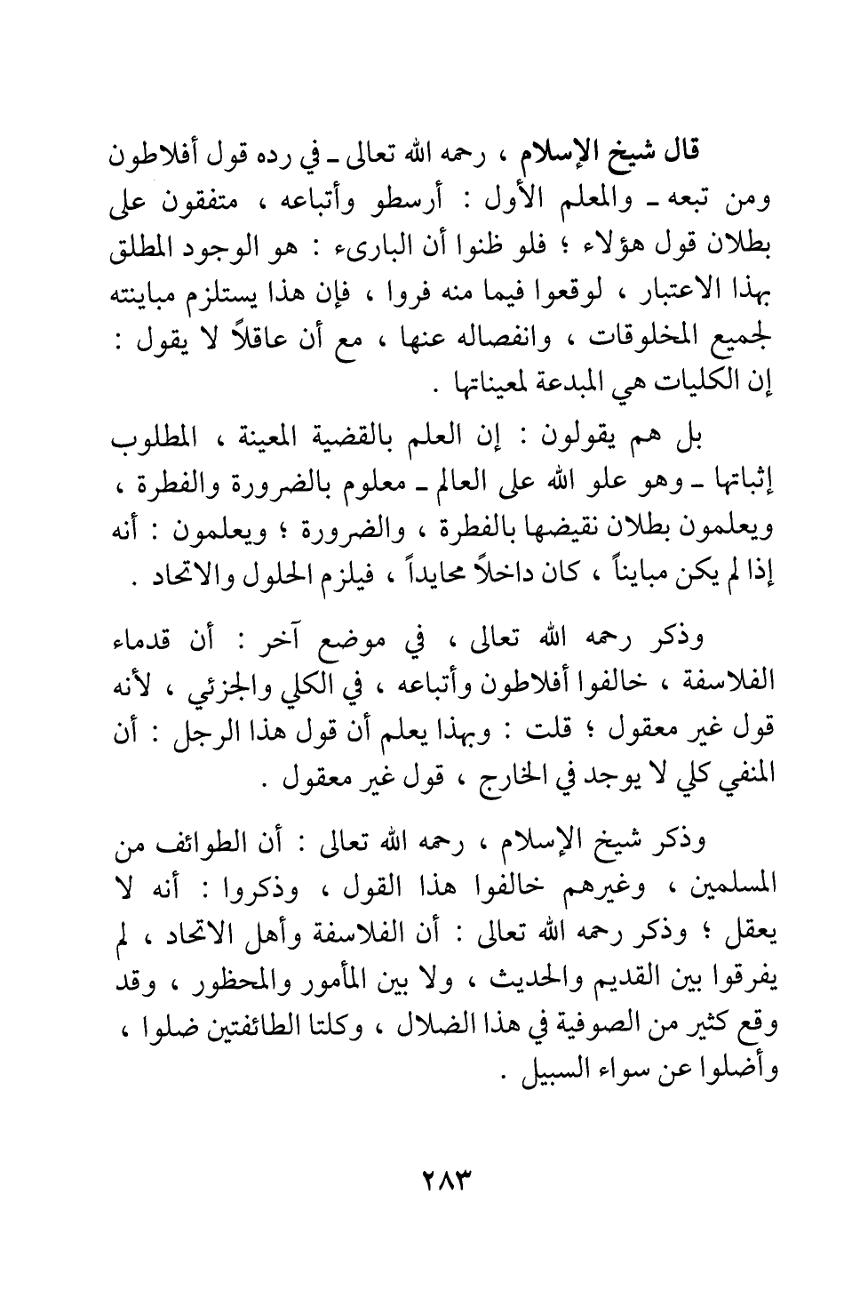 بل هم يقولون: إن العلم بالقضية المعينة المطلوب إثباتها- وهو علو الله على العالم- معلوم بالضرورة والفطرة، ويعلمون بطلان نقيضها بالفطرة والضرورة، ويعلمون أنه إذا لم يكن مباينا كان داخلا محايدا؛ فيلزم الحلول والاتحاد. وذكر رحمه الله تعالى، في موضع آخر أن قدماء الفلاسفة خالفوا أفلاطون وأتباعه، في الكلي والجزئي، لأنه قول غير معقول. قلت: وبهذا يعلم أن قول هذا الرجل أن المنفي كلي لا يوجد في الخارج، قول غير معقول.