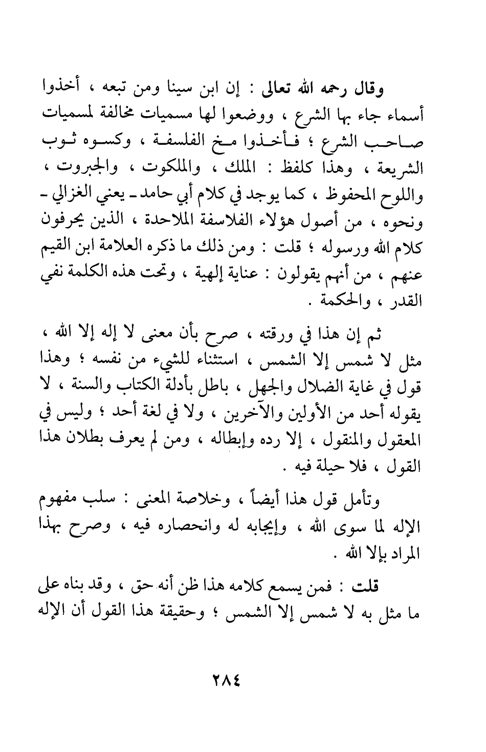 وقال رحمه الله تعالى: إن ابن سينا ومن تبعه، أخذوا أسماء جاء بها الشرع، ووضعوا لها مسميات مخالفة لمسميات صاحب الشرع، فأخذوا مخ الفلسفة، وكسوه ثوب الشريعة؛ وهذا كلفظ: الملك، والملكوت، والجبروت، واللوح المحفوظ كما يوجد في كلام أبي حامد -يعني الغزالي- ونحوه، من أصول هؤلاء الفلاسفة الملاحدة، الذين يحرفون كلام الله ورسوله. قلت: ومن ذلك ما ذكره العلامة ابن القيم عنهم، من أنهم يقولون: عناية إلهية، وتحت هذه الكلمة نفي القدر، والحكمة.