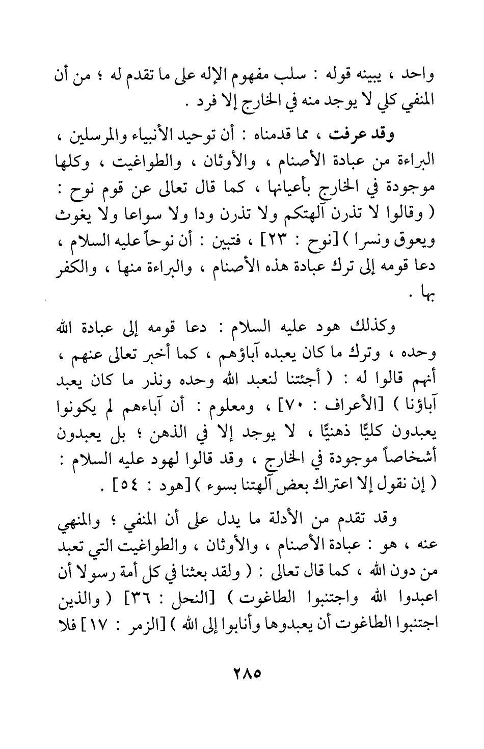وكذلك هود عليه السلام دعا قومه إلى عبادة الله وحده، وترك ما كان يعبده آباؤهم، كما أخبر تعالى عنهم، أنهم قالوا له: {أَجِئْتَنَا لِنَعْبُدَ اللَّهَ وَحْدَهُ وَنَذَرَ مَا كَانَ يَعْبُدُ آبَاؤُنَا} [سورة الأعراف آية: 70] ؛ ومعلوم أن آباءهم لم يكونوا يعبدون كليا ذهنيا لا يوجد إلا في الذهن، بل يعبدون أشخاصا موجودة في الخارج، وقد قالوا لهود عليه السلام: {إِنْ نَقُولُ إِلَّا اعْتَرَاكَ بَعْضُ آلِهَتِنَا بِسُوءٍ} [سورة هود آية: 54] . وقد تقدم من الأدلة ما يدل على أن المنفي والمنهي عنه، هو: عبادة الأصنام، والأوثان، والطواغيت التي تعبد من دون الله، كما قال تعالى: {وَلَقَدْ بَعَثْنَا فِي كُلِّ أُمَّةٍ رَسُولاً أَنِ اعْبُدُوا اللَّهَ وَاجْتَنِبُوا الطَّاغُوتَ} [سورة النحل آية: 36] ، {وَالَّذِينَ اجْتَنَبُوا الطَّاغُوتَ أَنْ يَعْبُدُوهَا وَأَنَابُوا إِلَى اللَّهِ} [سورة الزمر آية: 17] فلا