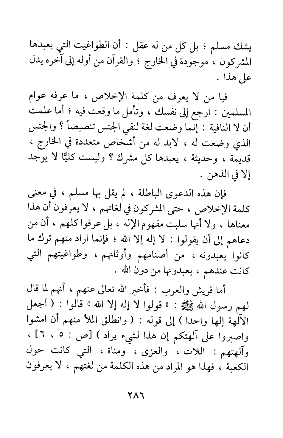فيا من لا يعرف من كلمة الإخلاص، ما عرفه عوام المسلمين، ارجع إلى نفسك، وتأمل ما وقعت فيه! أما علمت أن لا النافية إنما وضعت لغة لنفي الجنس تنصيصا؟ والجنس الذي وضعت له، لا بد له من أشخاص متعددة الخارج، قديمة، وحديثة، يعبدها كل مشرك، وليست كليا لا يوجد إلا في الذهن.