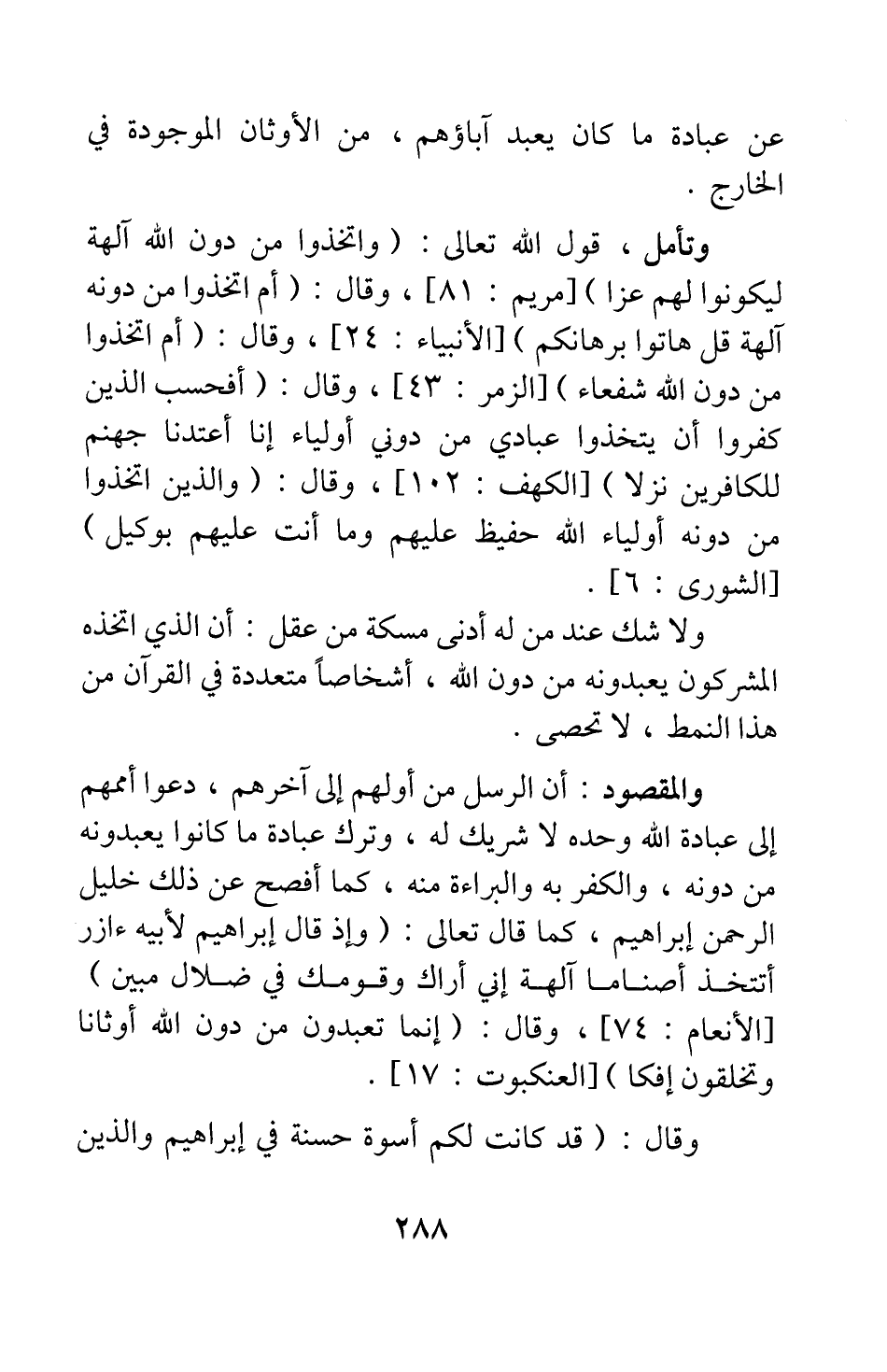 وتأمل، قول الله تعالى: {وَاتَّخَذُوا مِنْ دُونِ اللَّهِ آلِهَةً لِيَكُونُوا لَهُمْ عِزّاً} [سورة مريم آية: 81] ، وقال: {أَمِ اتَّخَذُوا مِنْ دُونِهِ آلِهَةً قُلْ هَاتُوا بُرْهَانَكُمْ} [سورة الأنبياء آية: 24] ، وقال: {أَمِ اتَّخَذُوا مِنْ دُونِ اللَّهِ شُفَعَاءَ} [سورة الزمر آية: 43] ، وقال: {أَفَحَسِبَ الَّذِينَ كَفَرُوا أَنْ يَتَّخِذُوا عِبَادِي مِنْ دُونِي أَوْلِيَاءَ إِنَّا أَعْتَدْنَا جَهَنَّمَ لِلْكَافِرِينَ نُزُلاً} [سورة الكهف آية: 102] ، وقال: {وَالَّذِينَ اتَّخَذُوا مِنْ دُونِهِ أَوْلِيَاءَ اللَّهُ حَفِيظٌ عَلَيْهِمْ وَمَا أَنْتَ عَلَيْهِمْ بِوَكِيلٍ} [سورة الشورى آية: 6] . ولا شك عند من له أدنى مسكة من عقل أن الذي اتخذه المشركون يعبدونه من دون الله، أشخاصا متعددة في القرآن من هذا النمط، لا تحصى.
