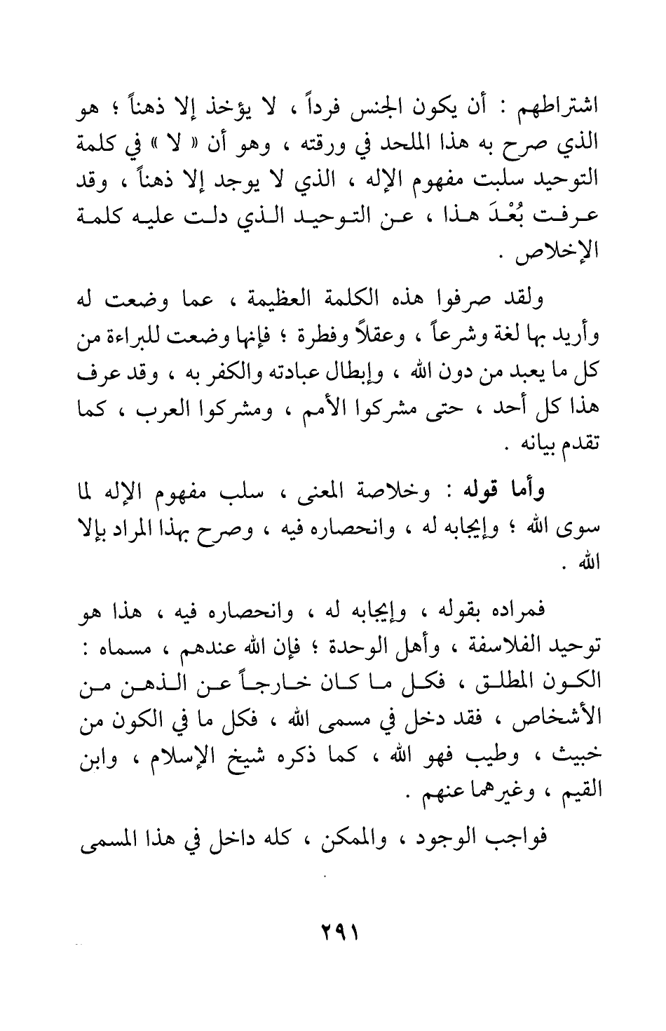 اشتراطهم: أن يكون الجنس فردا، لا يؤخذ إلا ذهنا، هو الذي صرح به هذا الملحد في ورقته، وهو أن "لا" في كلمة التوحيد سلبت مفهوم الإله الذي لا يوجد إلا ذهنا؛ وقد عرفت بعد هذا، عن التوحيد الذي دلت عليه كلمة الإخلاص.