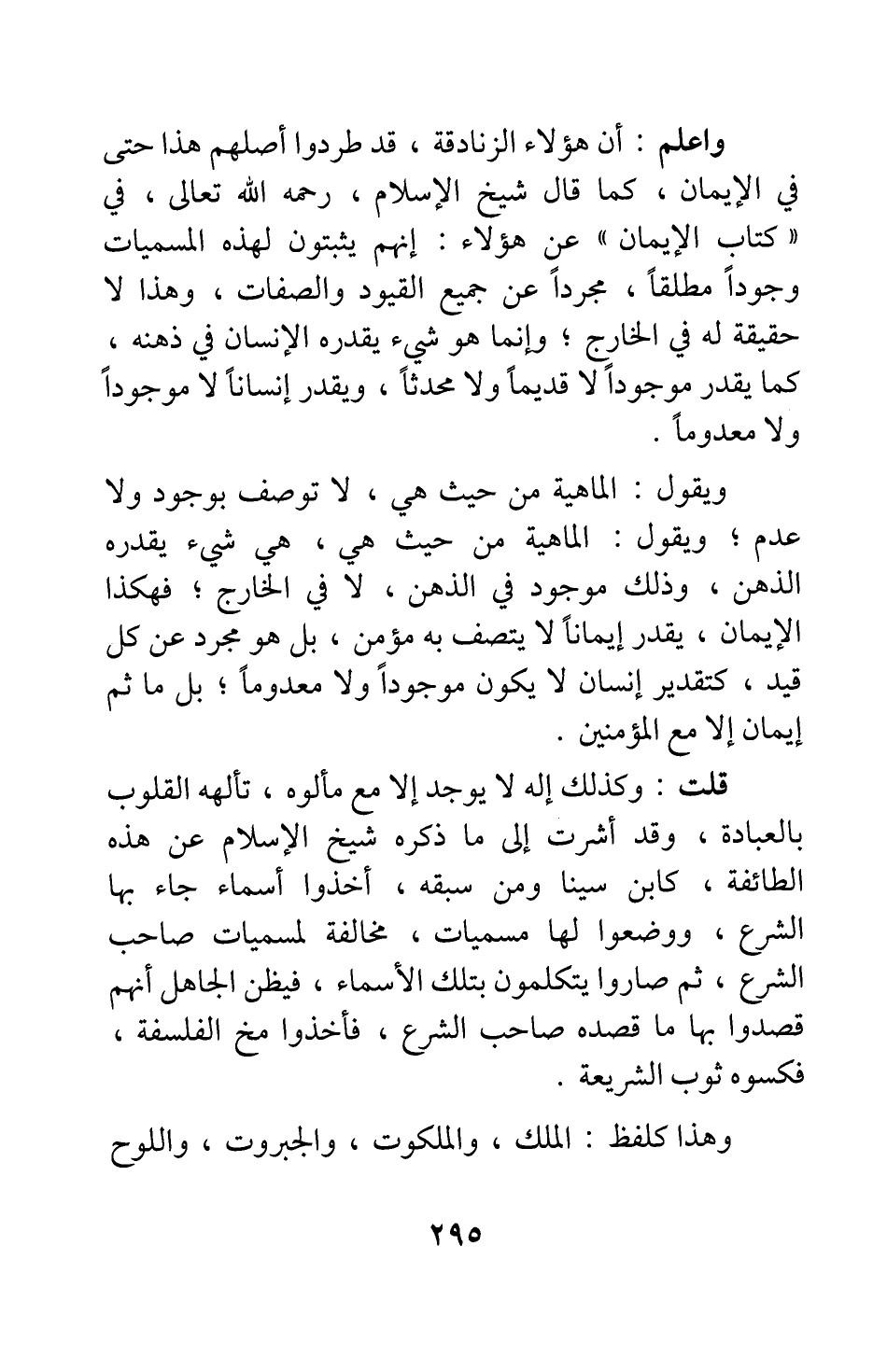 قلت: وكذلك إله لا يوجد إلا مع مألوه تألهه القلوب بالعبادة، وقد أشرت إلى ما ذكره شيخ الإسلام عن هذه الطائفة، كابن سينا ومن سبقه، أخذوا أسماء جاء بها الشرع، ووضعوا لها مسميات مخالفة لمسميات صاحب الشرع، ثم صاروا يتكلمون بتلك الأسماء، فيظن الجاهل أنهم قصدوا بها ما قصده صاحب الشرع؛ فأخذوا مخ الفلسفة، فكسوه ثوب الشريعة.