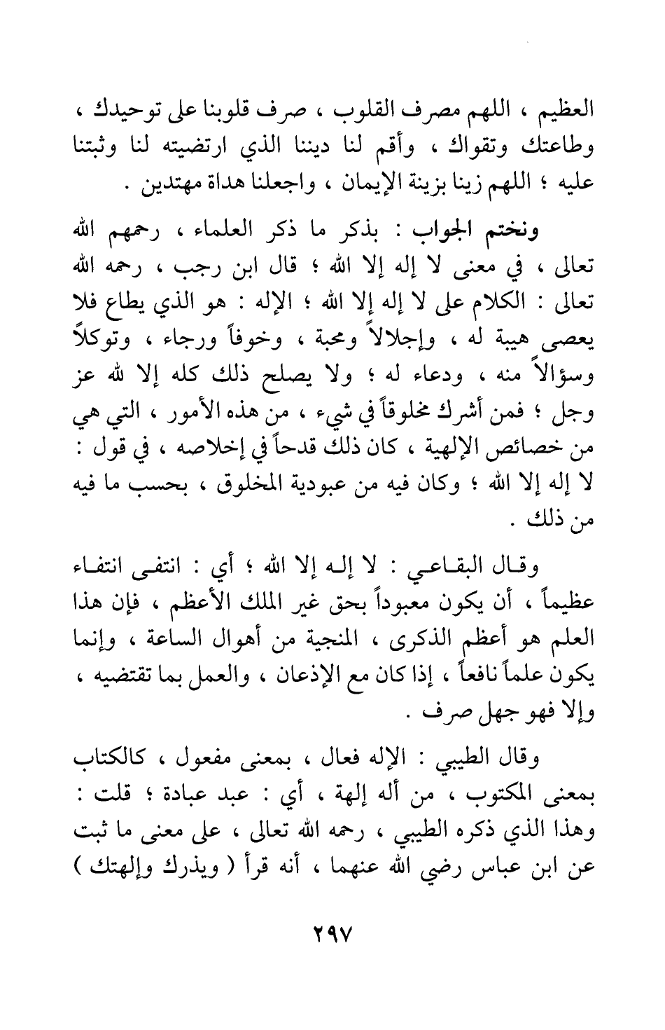 وقال البقاعي: لا إله إلا الله، أي: انتفى انتفاء عظيما أن يكون معبودا بحق غير الملك الأعظم؛ فإن هذا العلم هو أعظم الذكرى المنجية من أهوال الساعة، وإنما يكون علما نافعا، إذا كان مع الإذعان، والعمل بما تقتضيه، وإلا فهو جهل صرف. وقال الطيبي: الإله فعال، بمعنى مفعول، كالكتاب بمعنى المكتوب، من أله إلهة، أي: عبد عبادة. قلت: وهذا الذي ذكره الطيبي، رحمه الله تعالى، على معنى ما ثبت عن ابن عباس رضي الله عنهما، أنه قرأ {وَيَذَرَكَ وَآلِهَتَكَ}