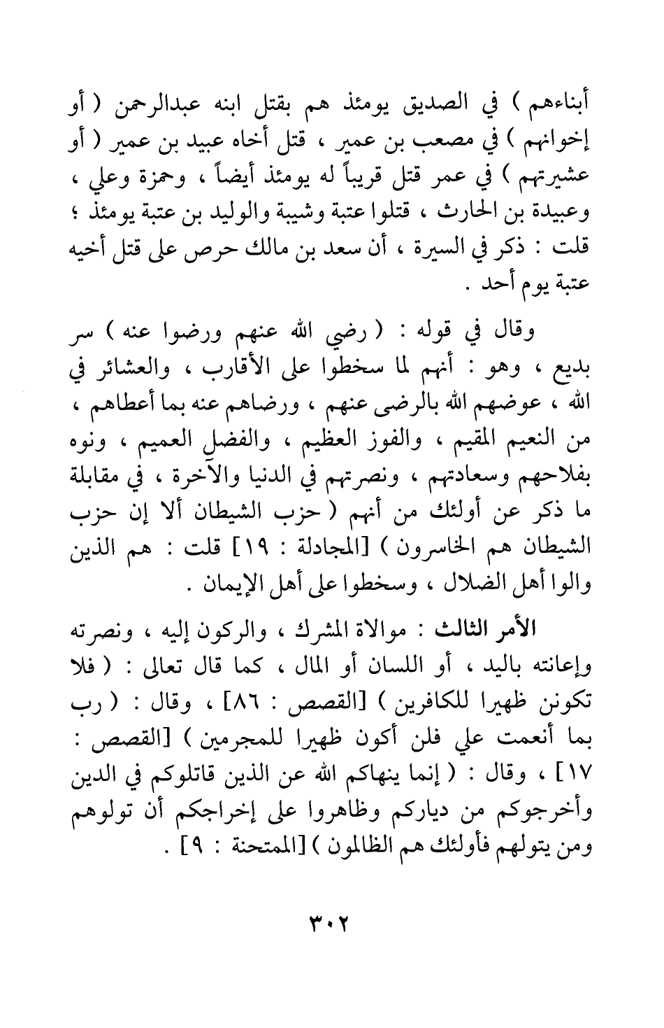 الأمر الثالث: موالاة المشرك، والركون إليه ونصرته وإعانته باليد، أو اللسان أو المال، كما قال تعالى: {فَلا تَكُونَنَّ ظَهِيراً لِلْكَافِرِينَ} [سورة القصص آية: 86] ، وقال: {رَبِّ بِمَا أَنْعَمْتَ عَلَيَّ فَلَنْ أَكُونَ ظَهِيراً لِلْمُجْرِمِينَ} [سورة القصص آية: 17] ، وقال: {إِنَّمَا يَنْهَاكُمُ اللَّهُ عَنِ الَّذِينَ قَاتَلُوكُمْ فِي الدِّينِ وَأَخْرَجُوكُمْ مِنْ دِيَارِكُمْ وَظَاهَرُوا عَلَى إِخْرَاجِكُمْ أَنْ تَوَلَّوْهُمْ وَمَنْ يَتَوَلَّهُمْ فَأُولَئِكَ هُمُ الظَّالِمُونَ} [سورة الممتحنة آية: 9] .