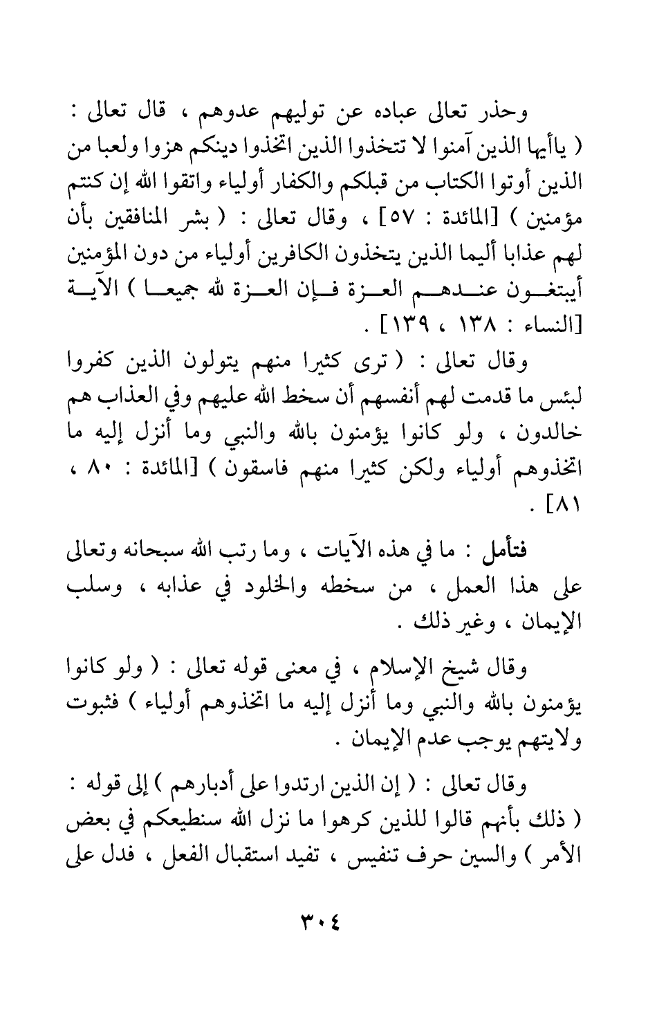 وقال تعالى: {تَرَى كَثِيراً مِنْهُمْ يَتَوَلَّوْنَ الَّذِينَ كَفَرُوا لَبِئْسَ مَا قَدَّمَتْ لَهُمْ أَنْفُسُهُمْ أَنْ سَخِطَ اللَّهُ عَلَيْهِمْ وَفِي الْعَذَابِ هُمْ خَالِدُونَ وَلَوْ كَانُوا يُؤْمِنُونَ بِاللَّهِ وَالنَّبِيِّ وَمَا أُنْزِلَ إِلَيْهِ مَا اتَّخَذُوهُمْ أَوْلِيَاءَ وَلَكِنَّ كَثِيراً مِنْهُمْ فَاسِقُونَ} [سورة المائدة آية: 80-81] .